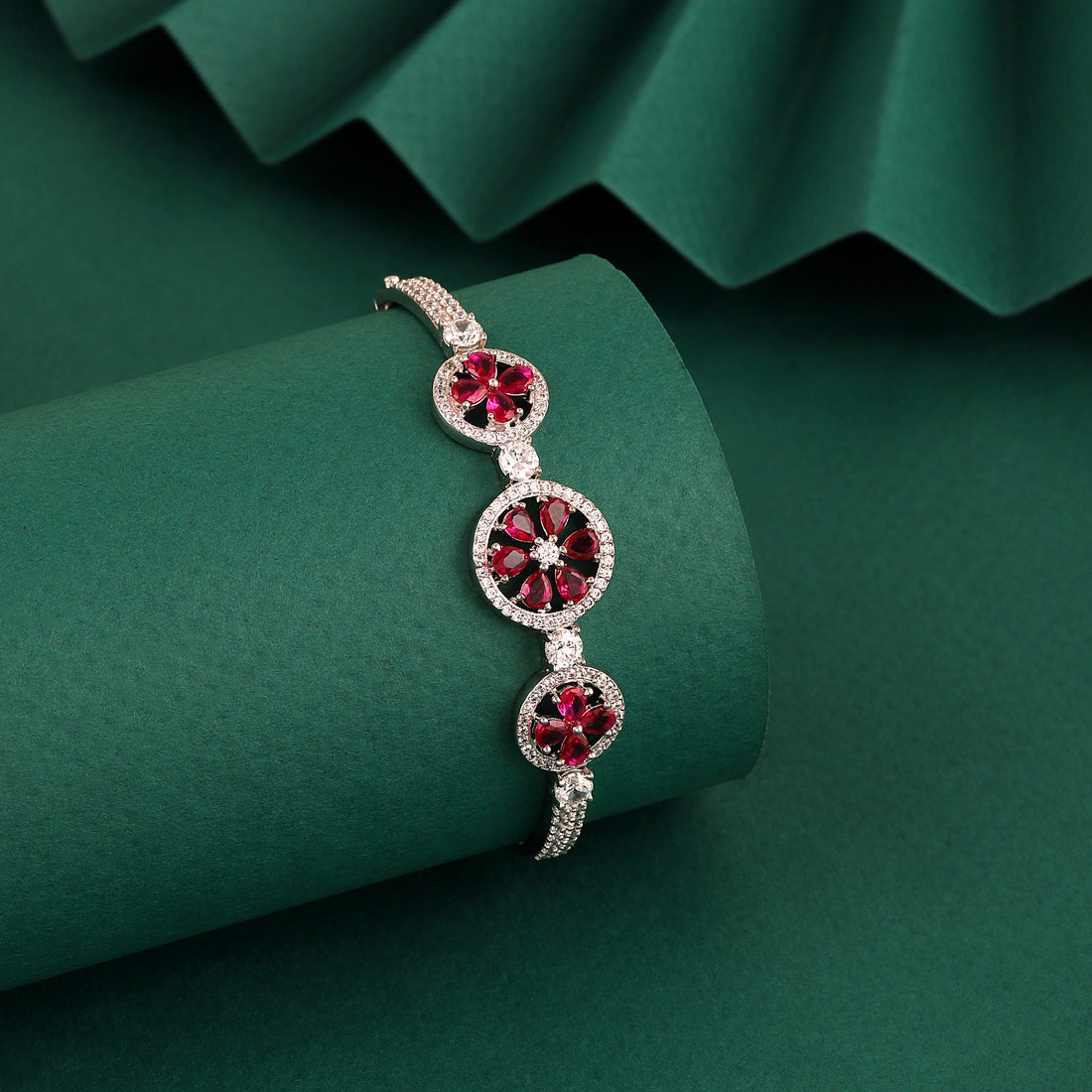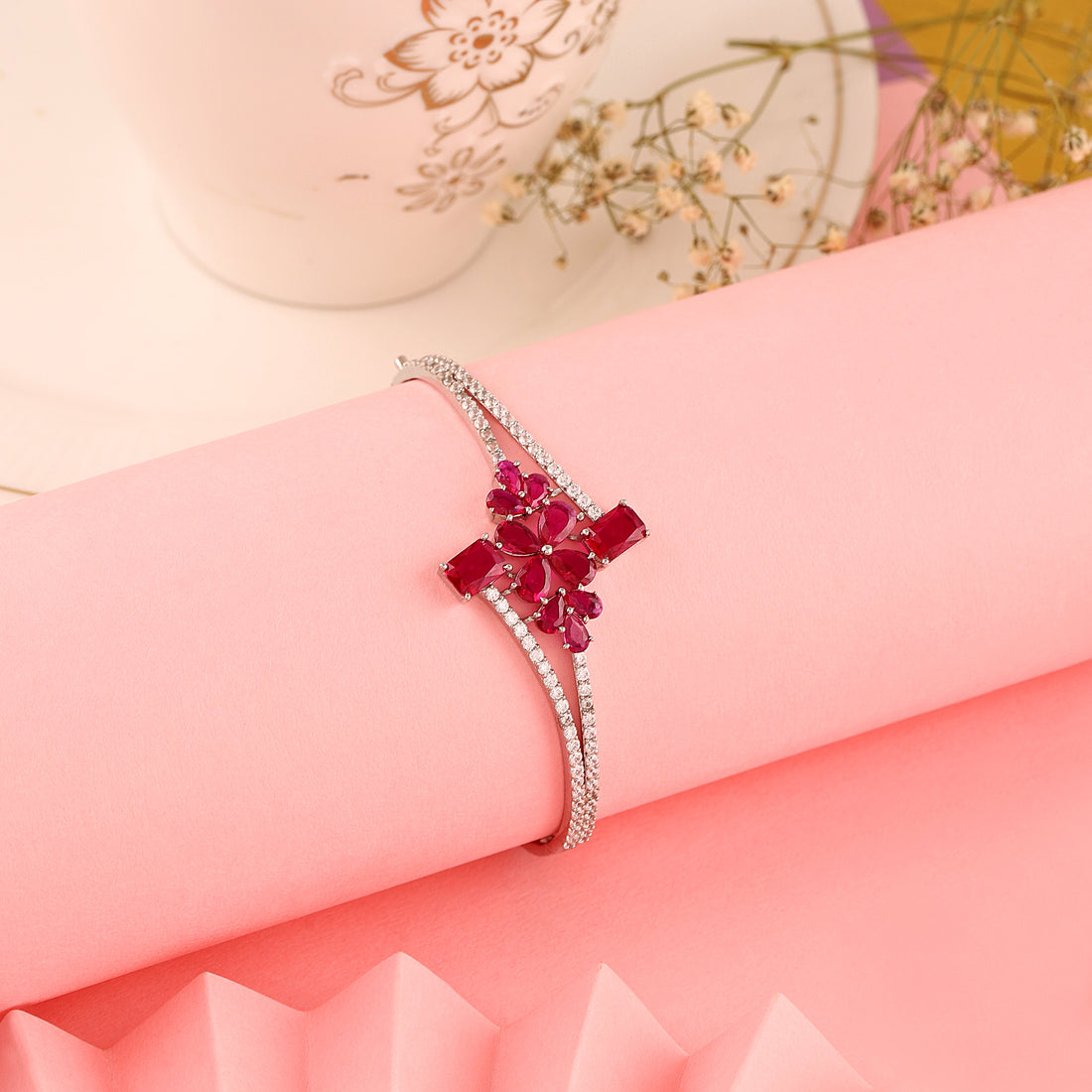 💎 925 Silver Ruby & Diamond-Simulant Floral Cuff Bracelet