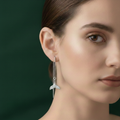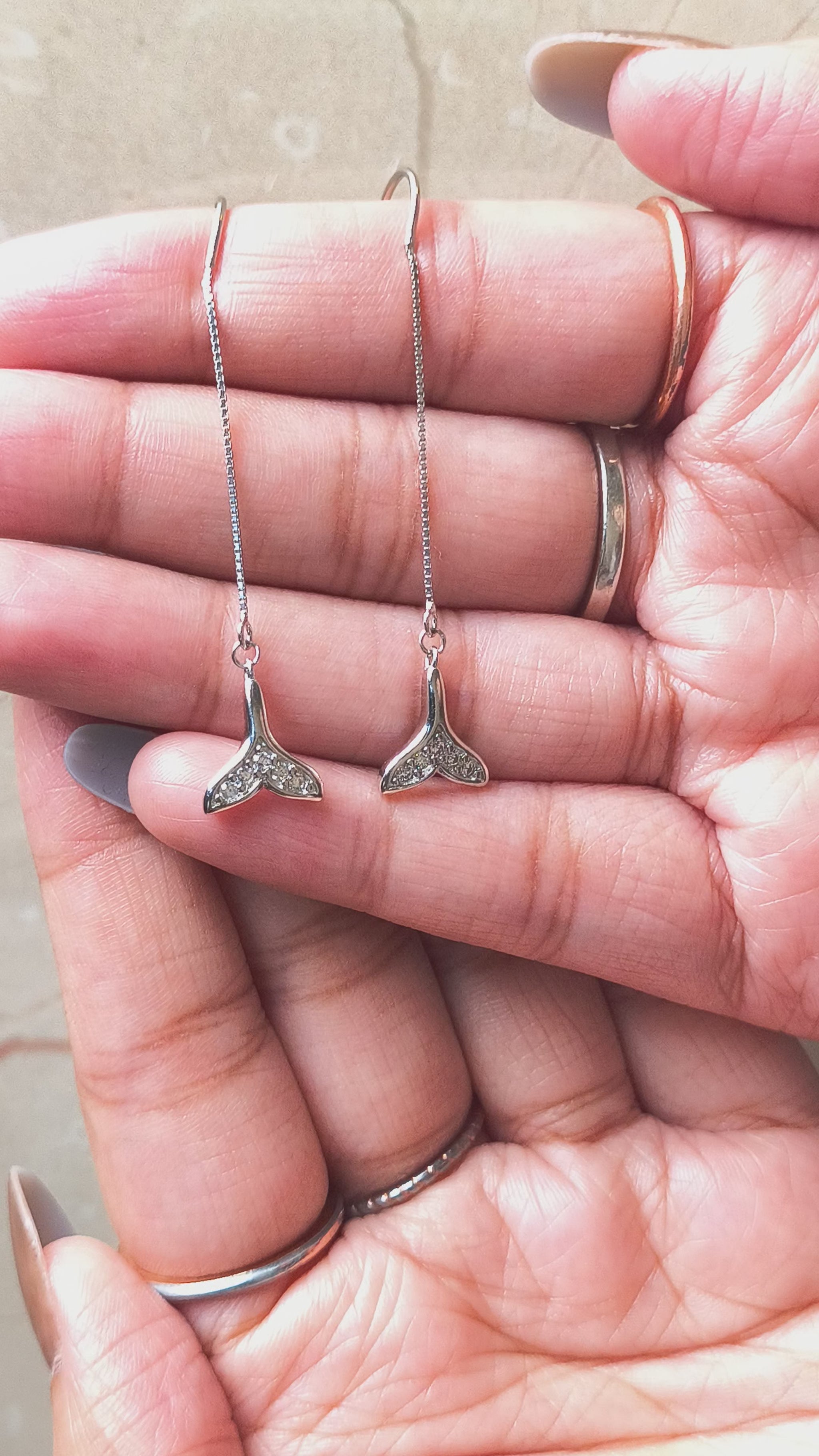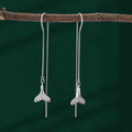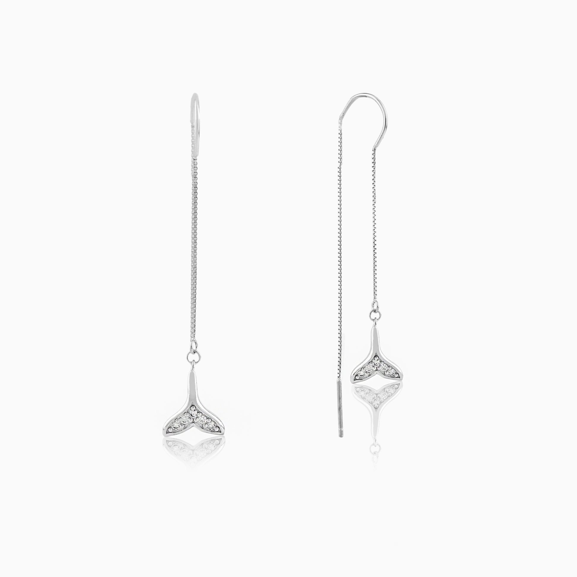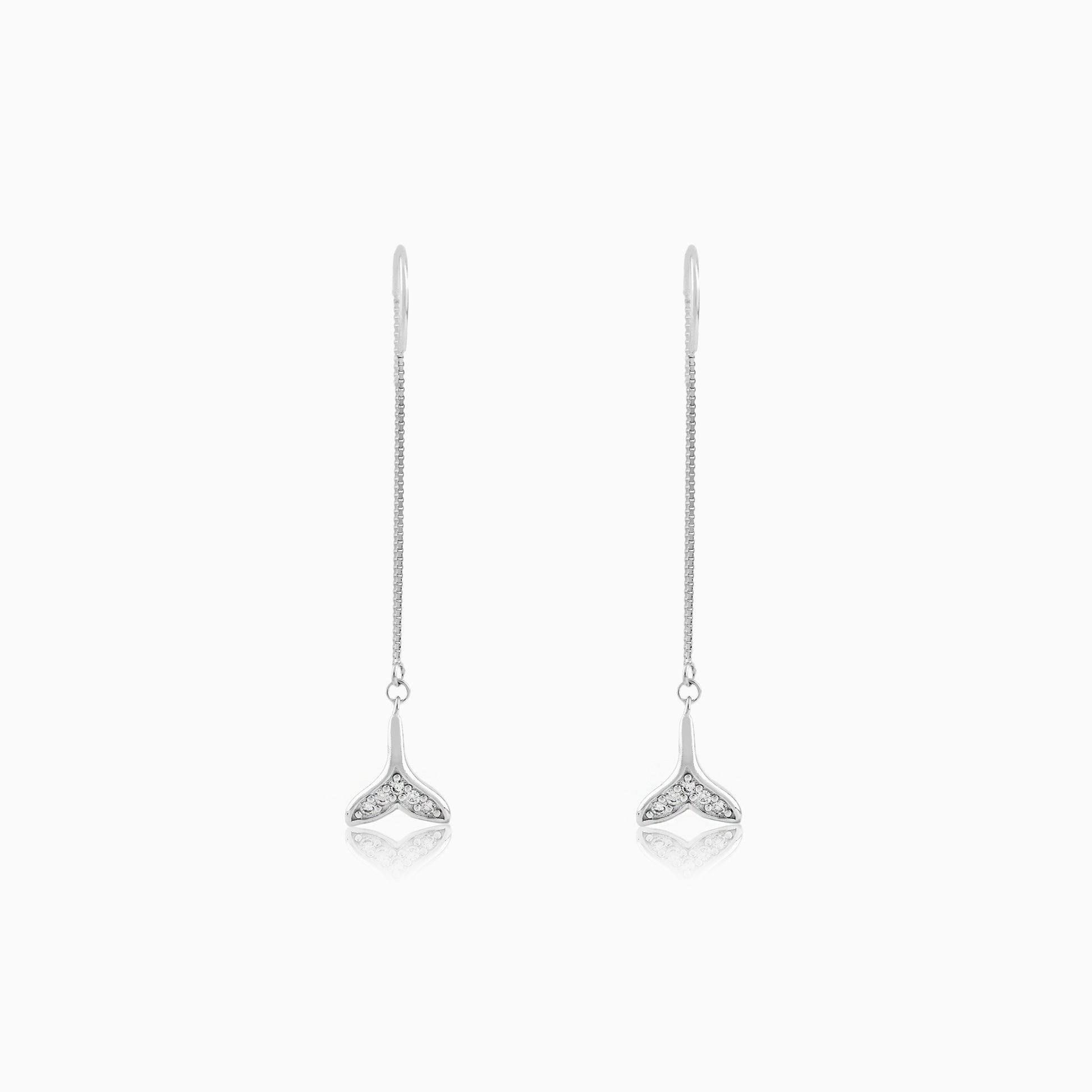 These mesmerizing and unique drop earrings are crafted from genuine 925 silver, featuring a delicate box chain that threads gracefully through the ear for a subtle, long dangle. The charm at the end is shaped like a graceful mermaid or whale tail, beautifully adorned with brilliant pave-set crystals that catch the light. This whimsical and sleek design offers effortless movement and a modern aesthetic. It's the perfect gift for ocean lovers or anyone seeking contemporary elegance.