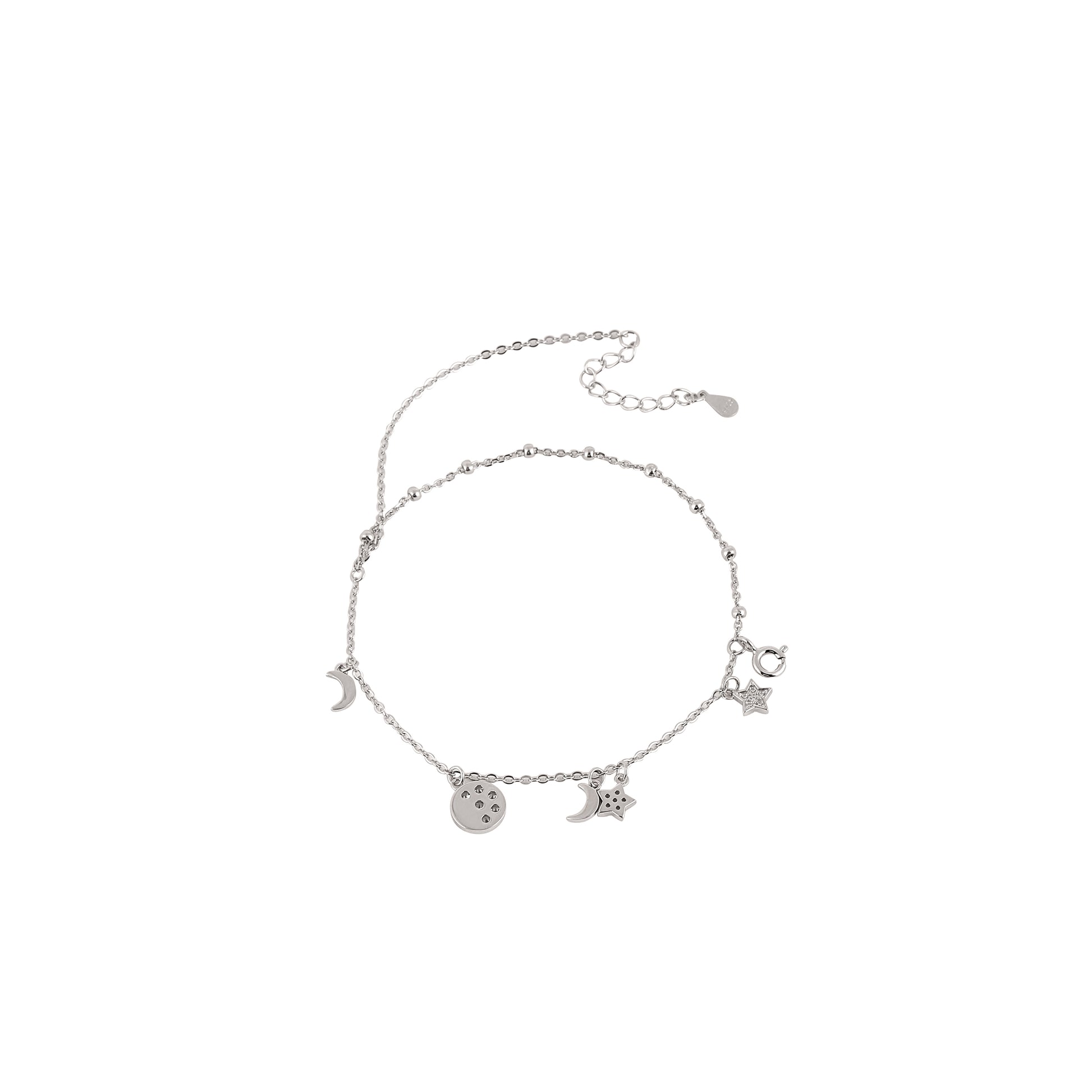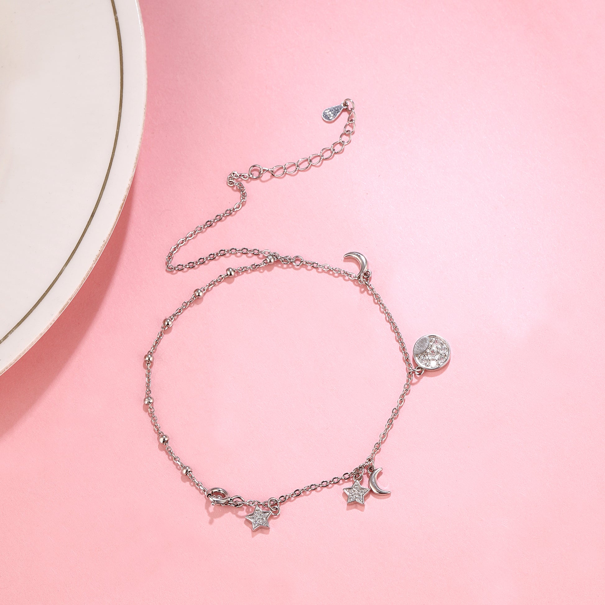 Capture the magic of the night sky with this enchanting Celestial Moonlight charm bracelet, expertly forged in high-quality 925 silver. This whimsical design showcases a beautiful array of pavé-set stars, crescent moons, and a brilliant, stone-studded orb charm that radiate a celestial glow. Meticulously designed with a dainty link chain and a secure adjustable clasp, this 925 silver bracelet is the perfect choice for those who love ethereal, high-fashion sparkle.