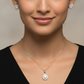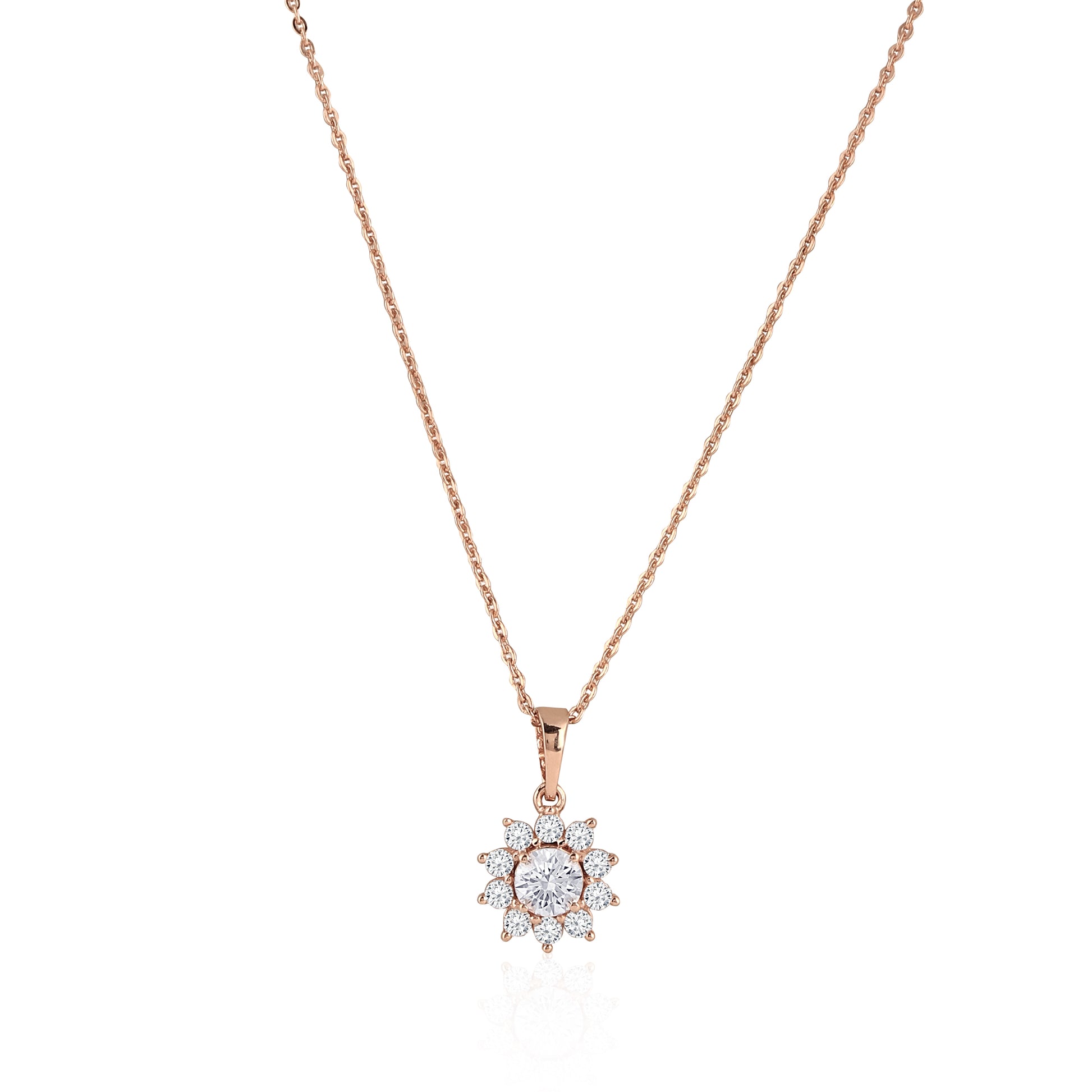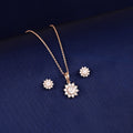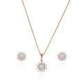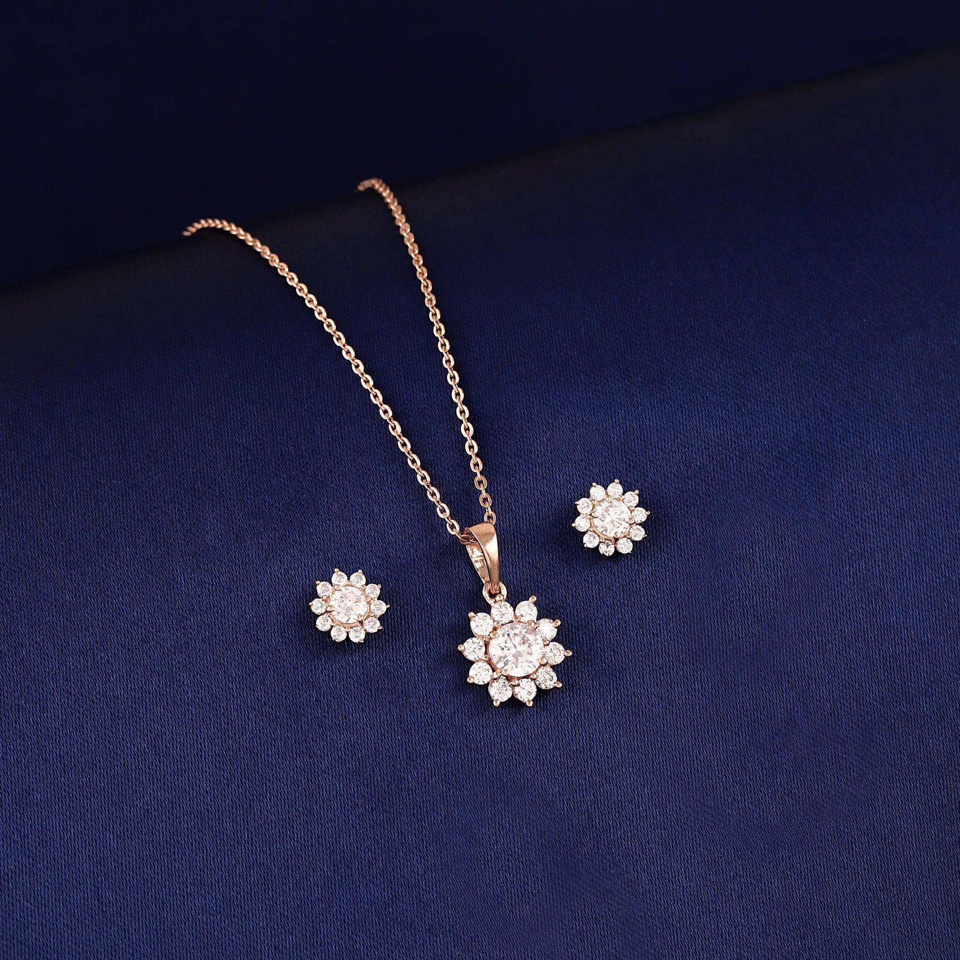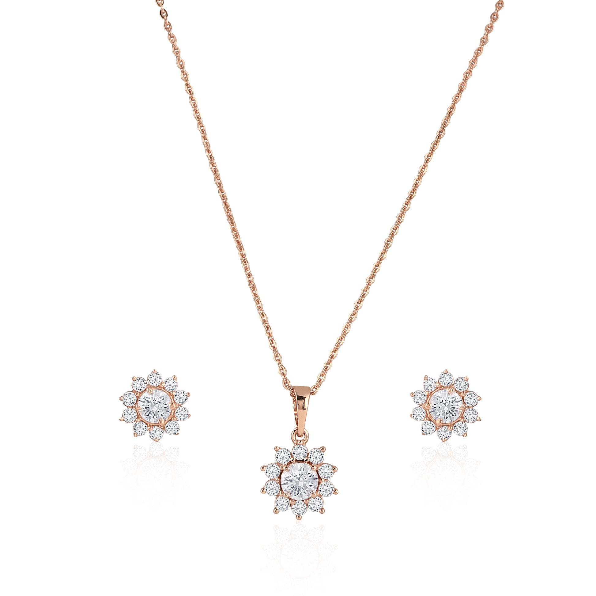 Elevate your elegance with this stunning floral-inspired jewelry set crafted from 925 sterling silver and finished with a luxurious rose-gold polish. The pendant and matching earrings feature a radiant flower design made of sparkling stones arranged in a delicate halo. Perfect for both daily wear and special occasions, this set adds a touch of timeless charm and brilliance to any outfit.