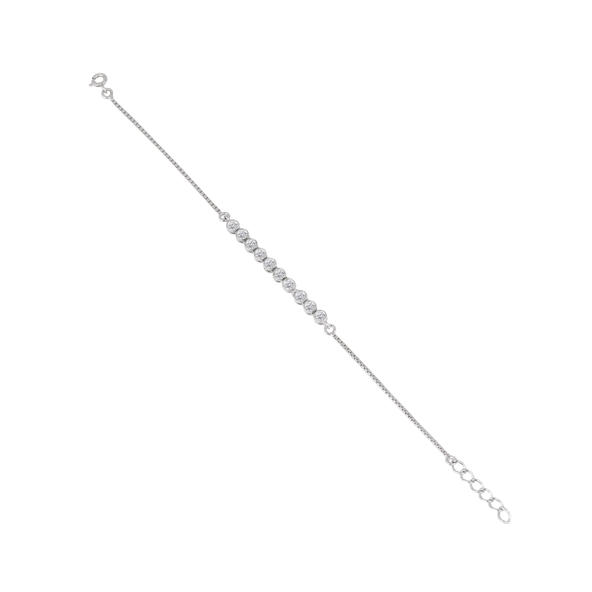This refined piece features a striking arc of 10 shimmering round-cut stones for a clean, minimalist aesthetic. Handcrafted in 925 silver, it offers a subtle yet luxurious glow that transitions effortlessly from day to night. The Venetian-style box chain provides a fluid, comfortable fit and is known for its durability and resistance to tangling. This versatile jewelry piece is the perfect finishing touch for a polished, professional look.
