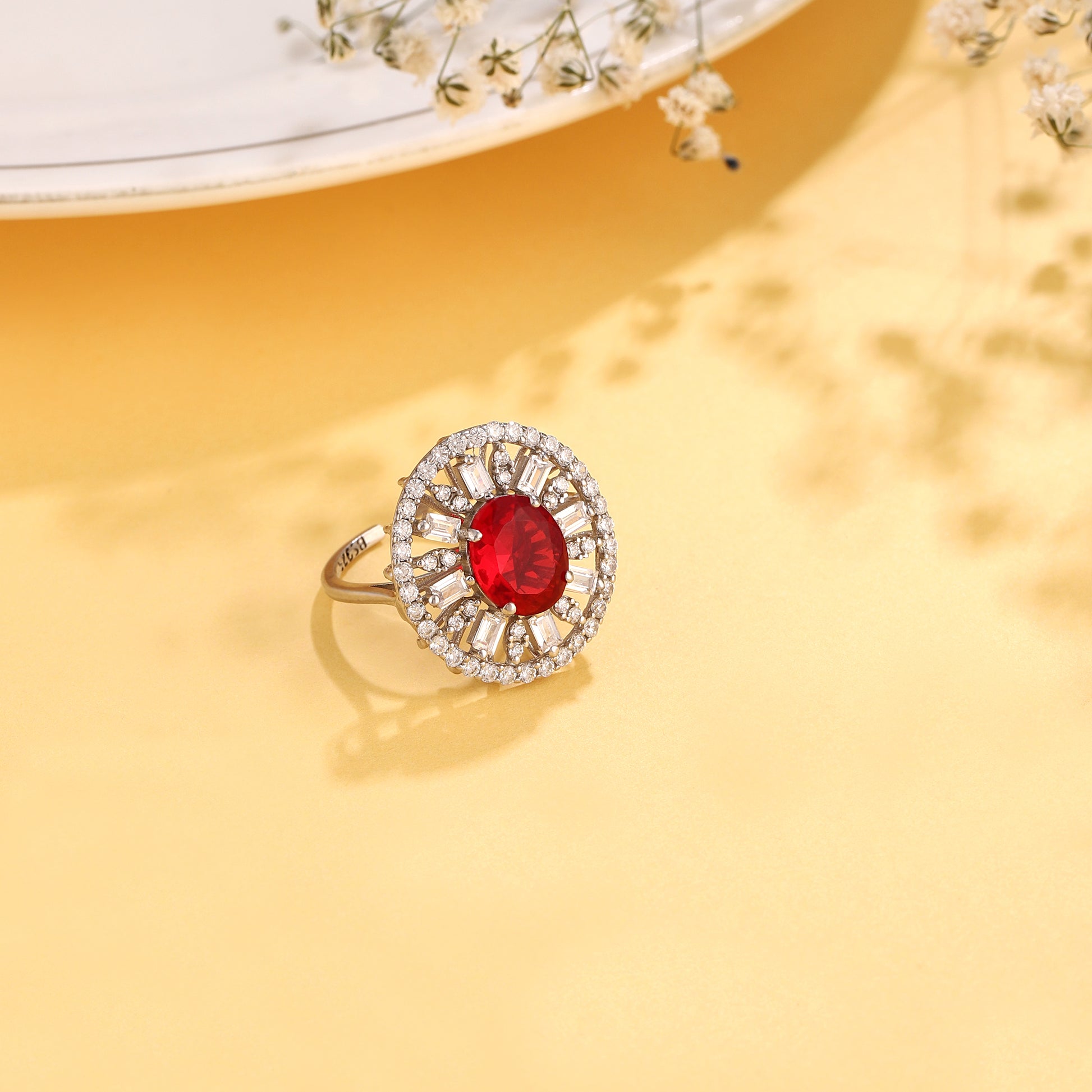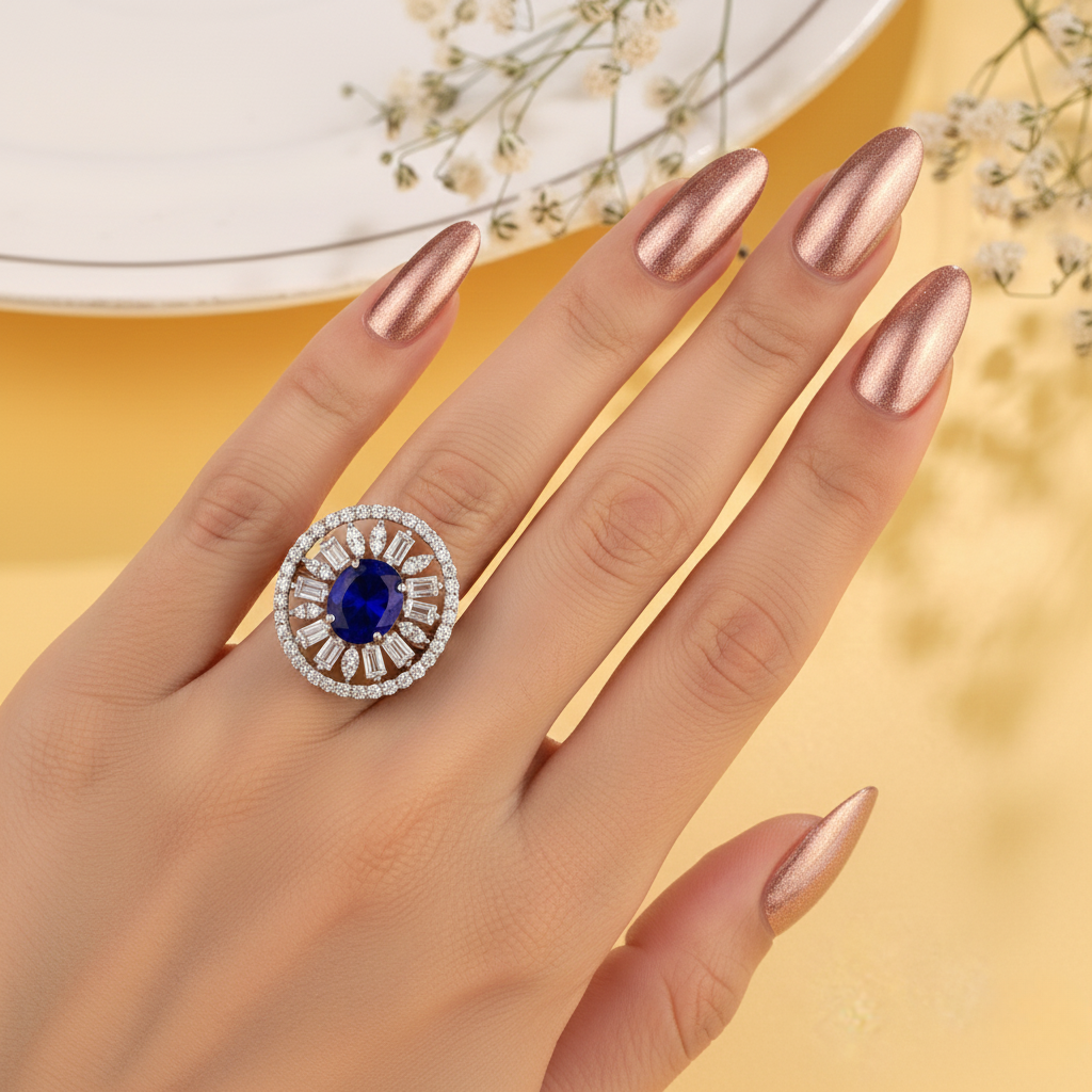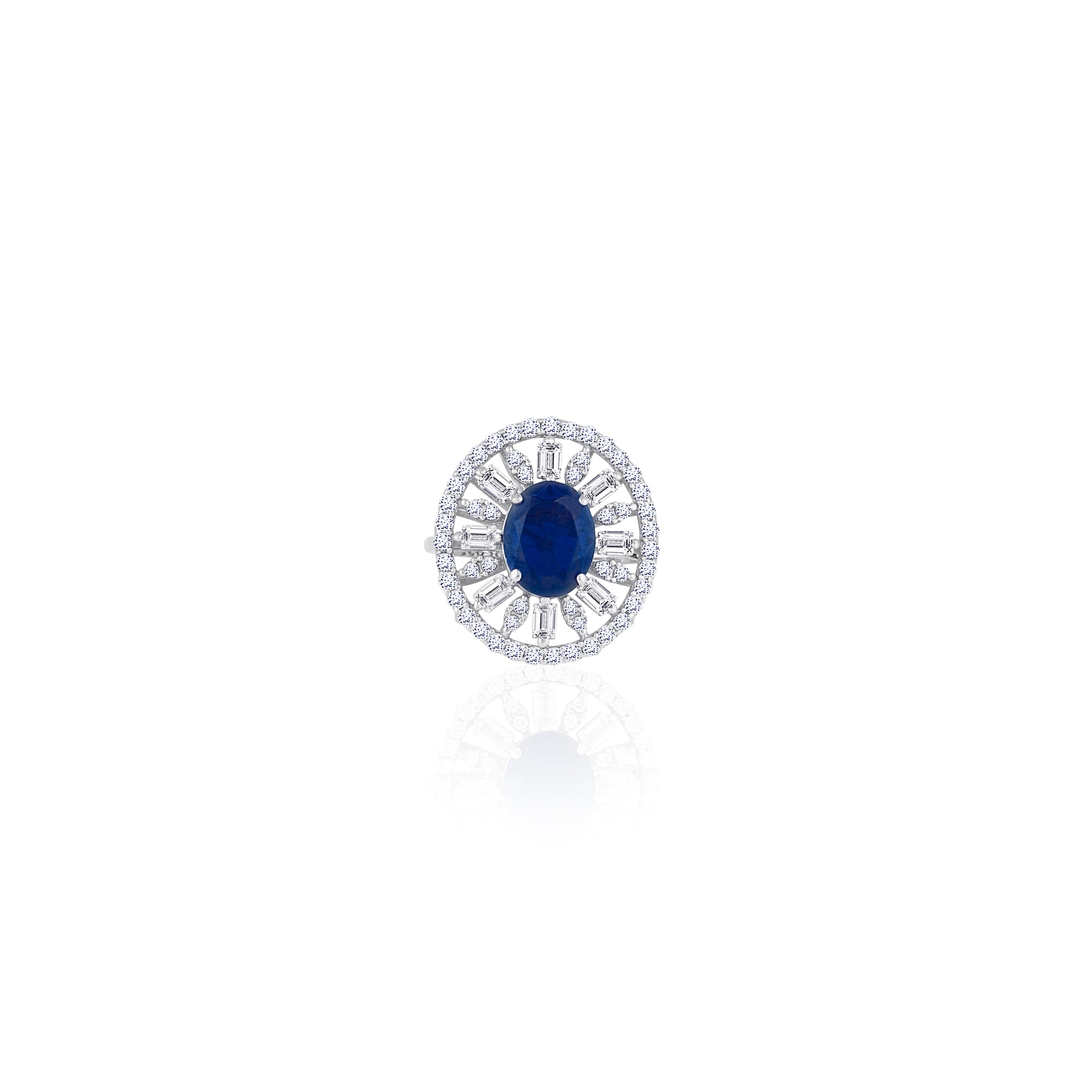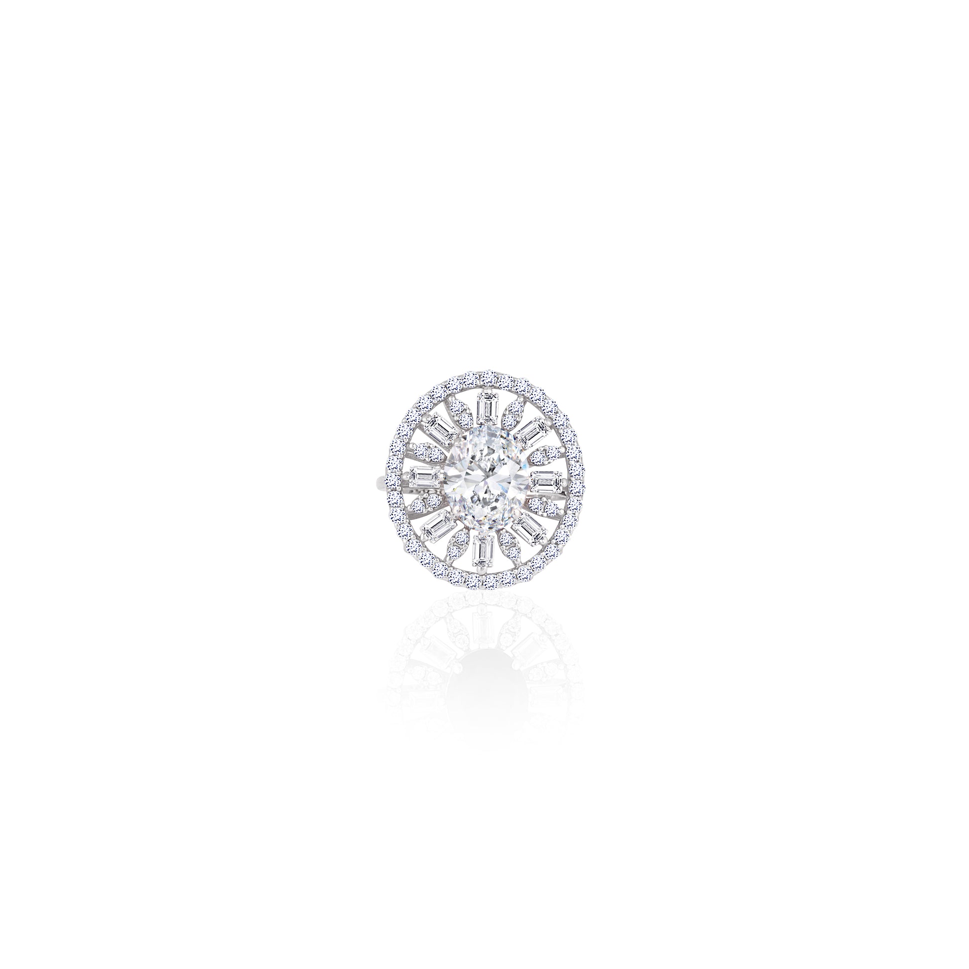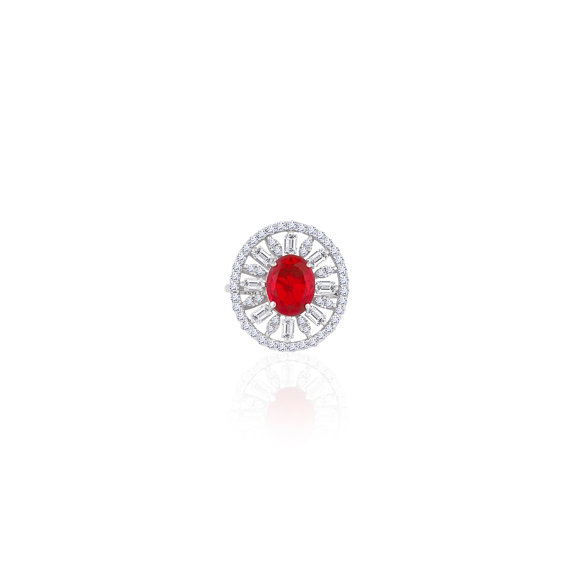 Radiate pure brilliance with this classic oval sunburst cocktail ring, meticulously handcrafted in high-shine 925 silver. This statement ring is available in four captivating colorways—Timeless Diamond-White, Fiery Ruby-Red, Regal Sapphire-Blue, and Lush Emerald-Green—each featuring a stunning oval center stone framed by a majestic halo of shimmering baguette and round accents. Designed with an adjustable open-back band, this 925 silver ring offers a comfortable fit for any finger, ensuring its sophisticated sparkle and brilliant glow shine effortlessly throughout your most important life events.