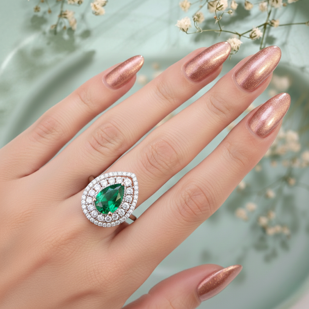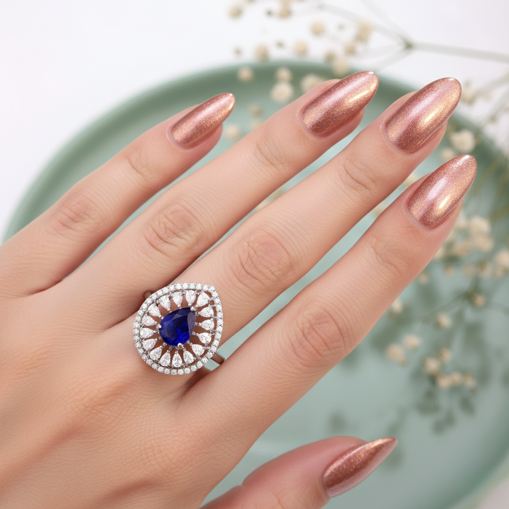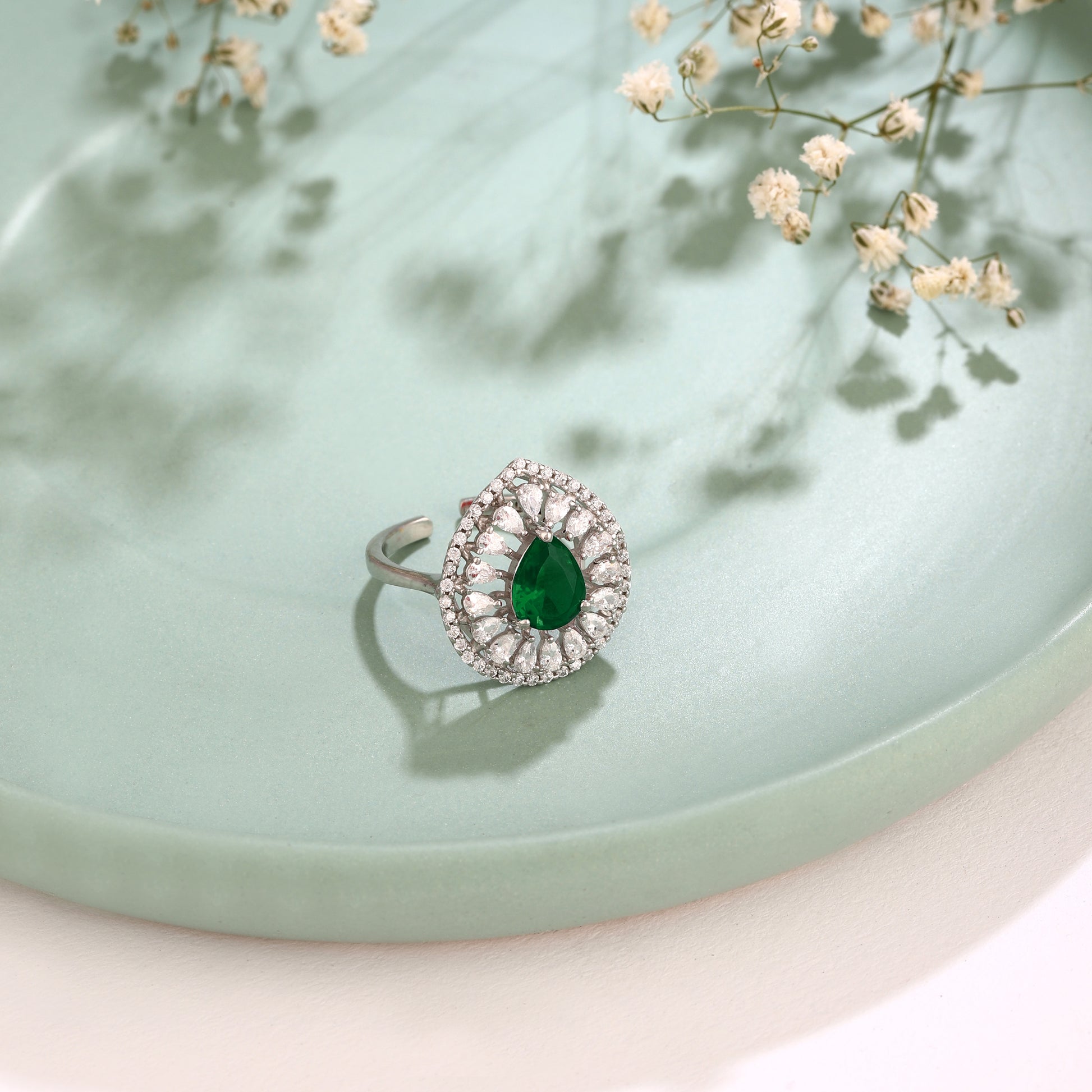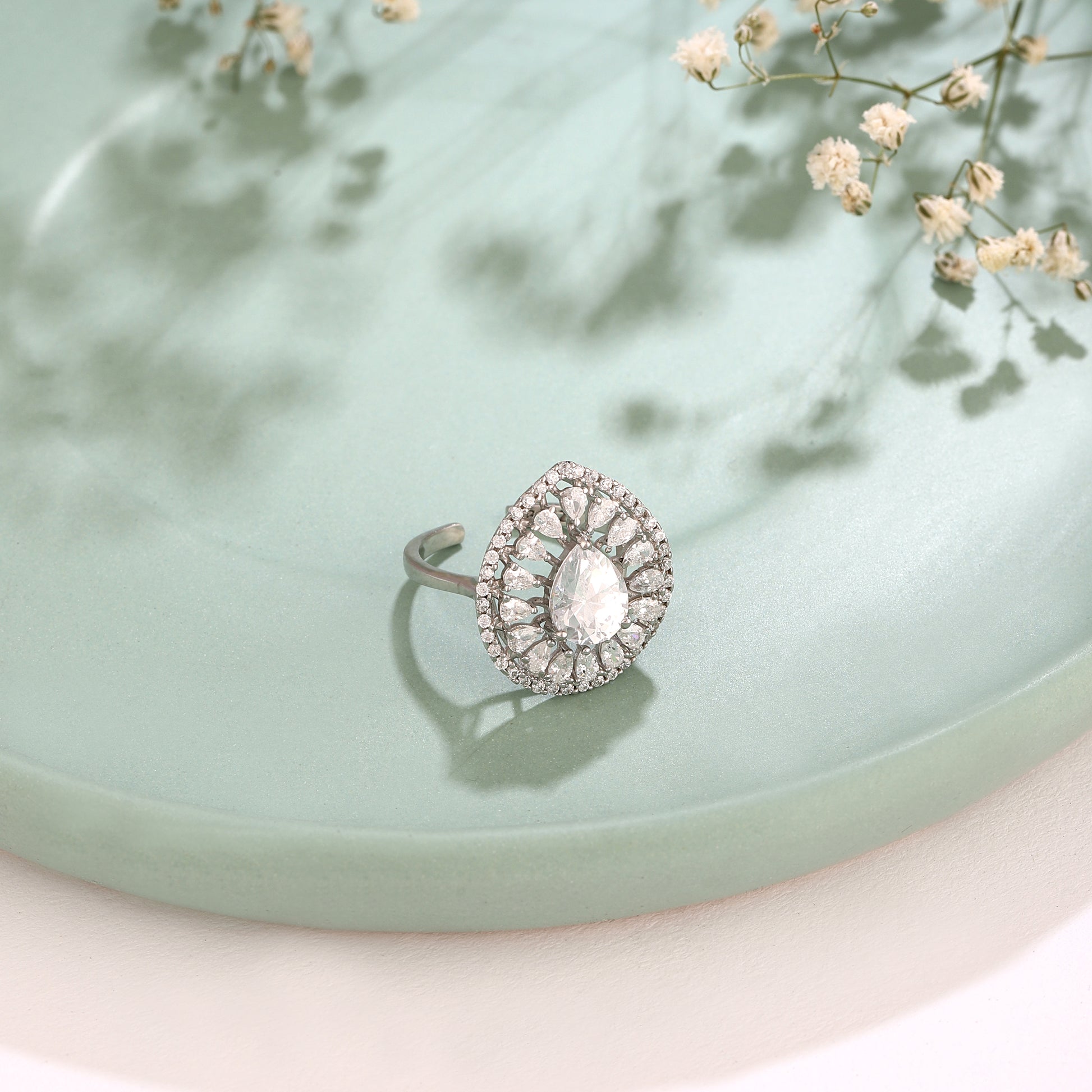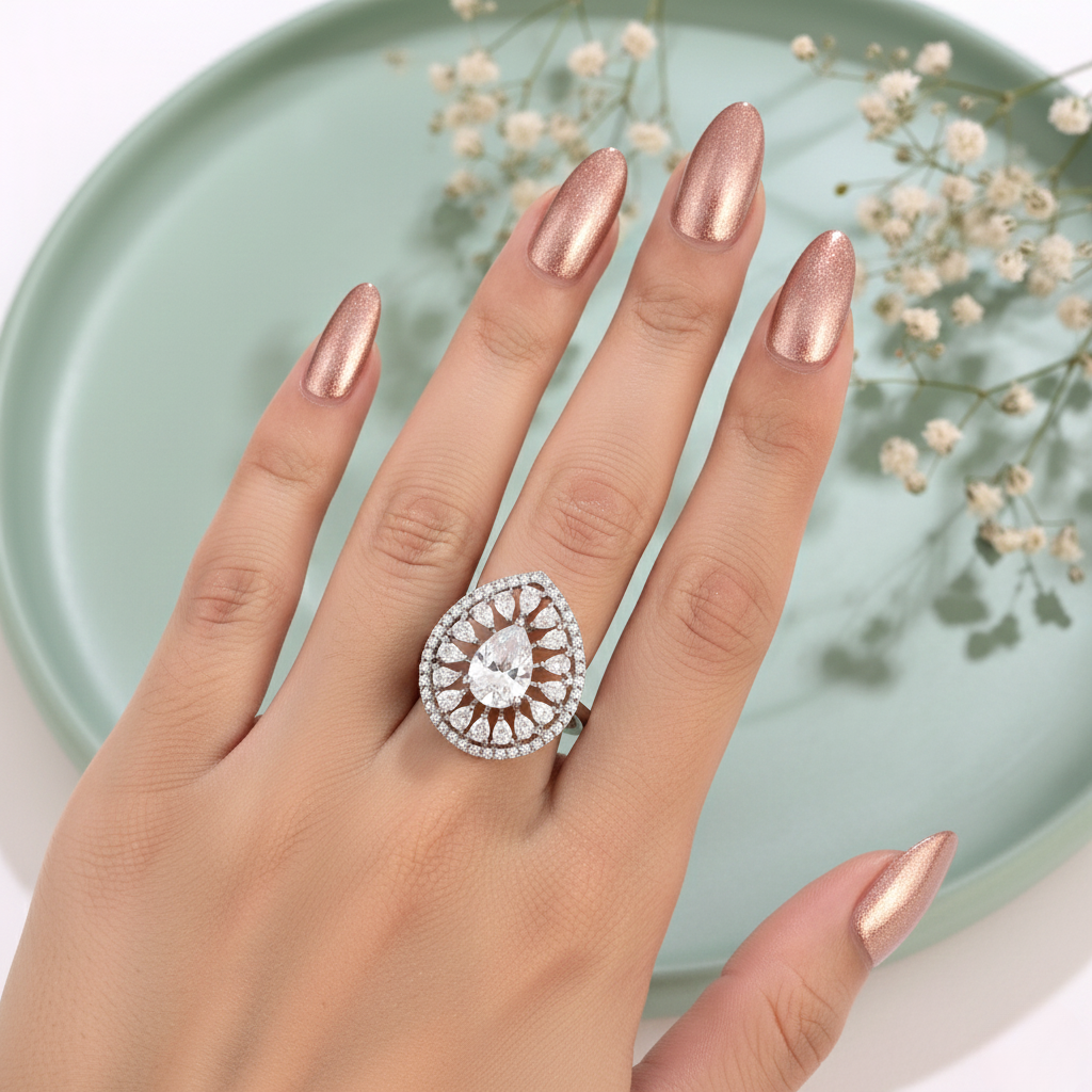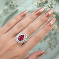 Radiate pure brilliance with this classic teardrop halo cocktail ring, meticulously handcrafted in high-shine 925 silver. This statement ring is available in four captivating colorways—Timeless Diamond-White, Fiery Ruby-Red, Regal Sapphire-Blue, and Lush Emerald-Green—each featuring a stunning pear-cut center stone framed by a majestic halo of shimmering baguette and round accents. Designed with an adjustable open-back band, this 925 silver ring offers a comfortable fit for any finger, ensuring its sophisticated sparkle and brilliant glow shine effortlessly throughout your most important life events.