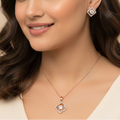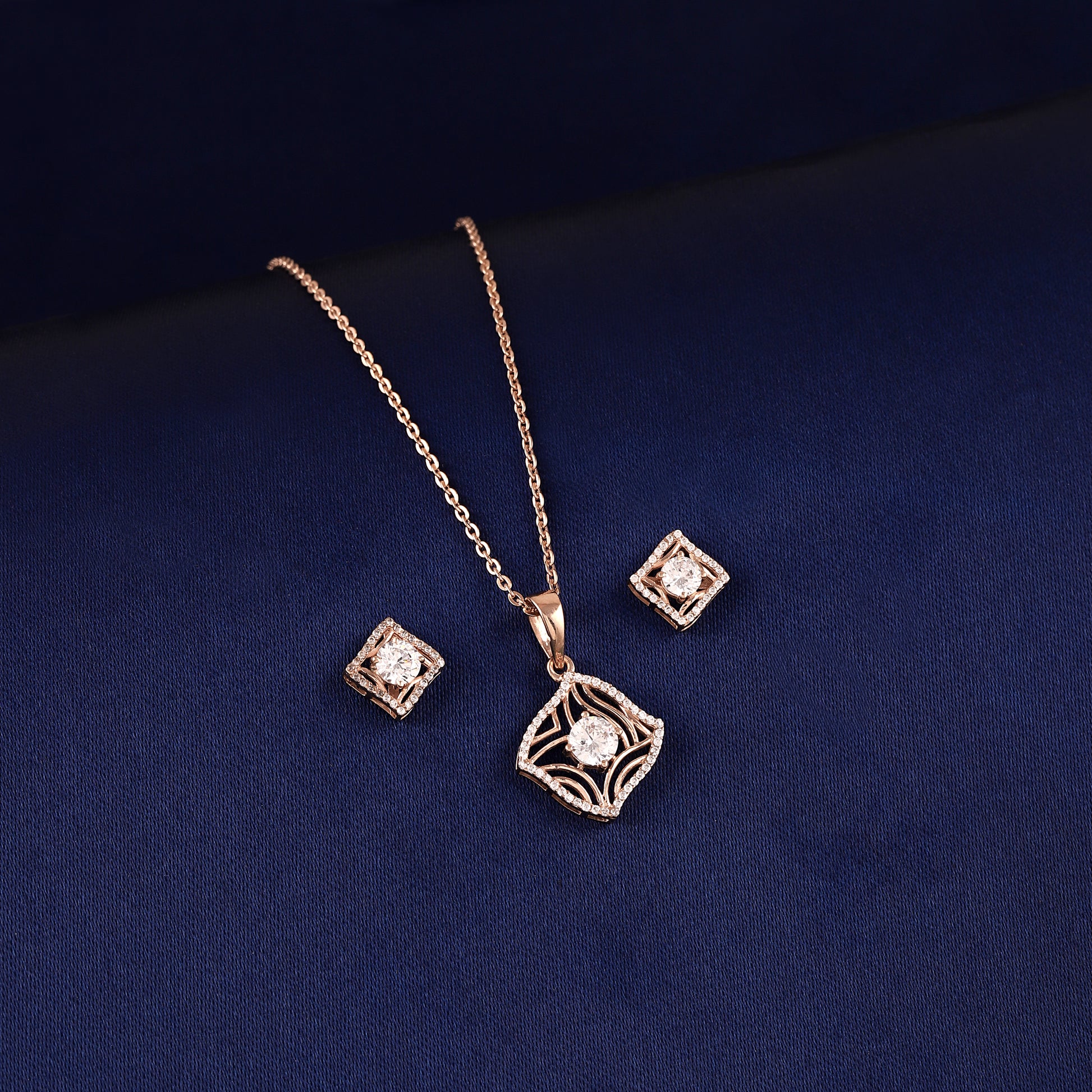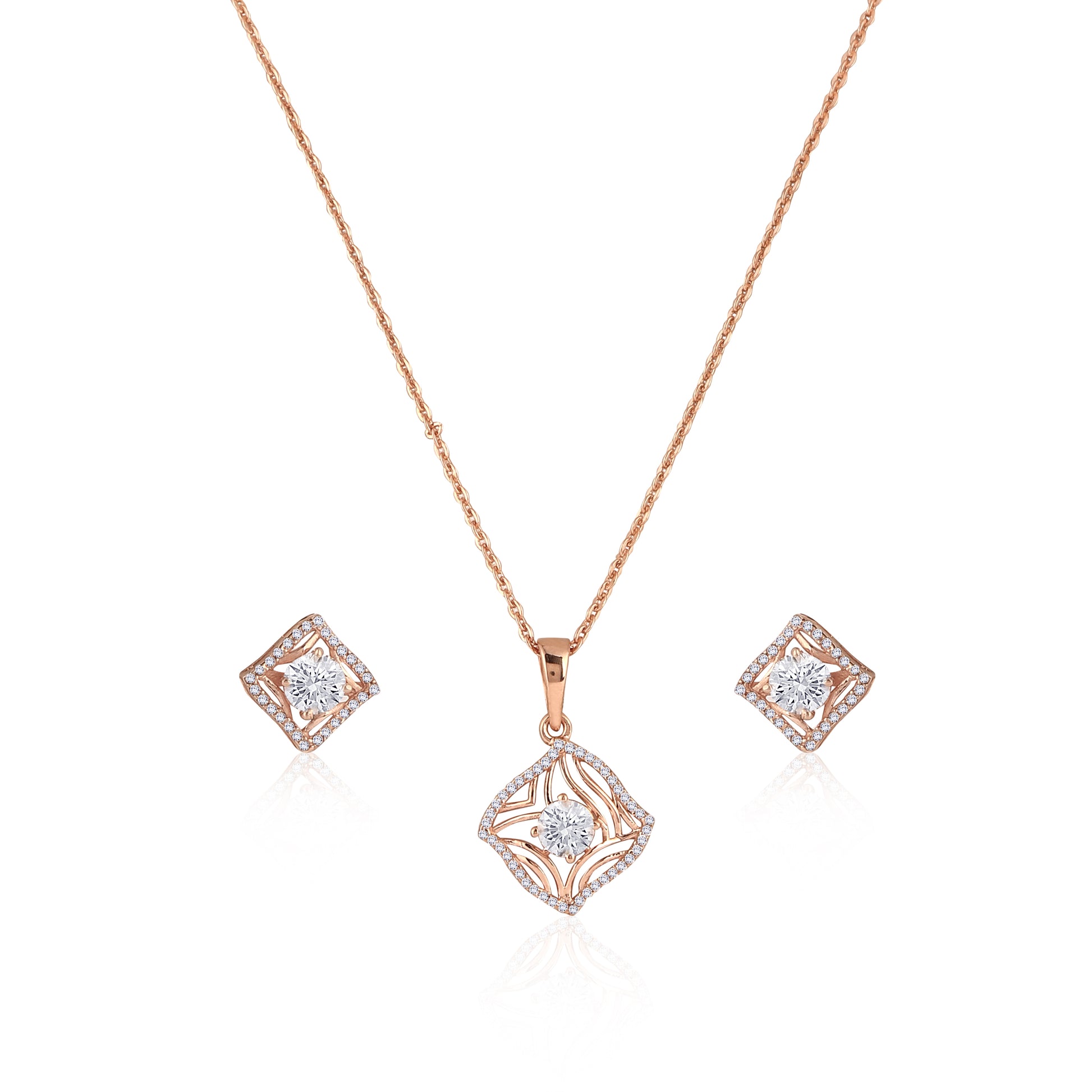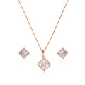 Enhance your look with this elegant vintage-inspired jewelry set crafted from 925 sterling silver and finished in a warm rose-gold tone. The pendant and earrings feature a unique square design with intricate openwork detailing and a brilliant center stone that adds refined sparkle. Perfect for elevating everyday style or complementing your outfit on special occasions, this set offers a timeless blend of charm and sophistication.