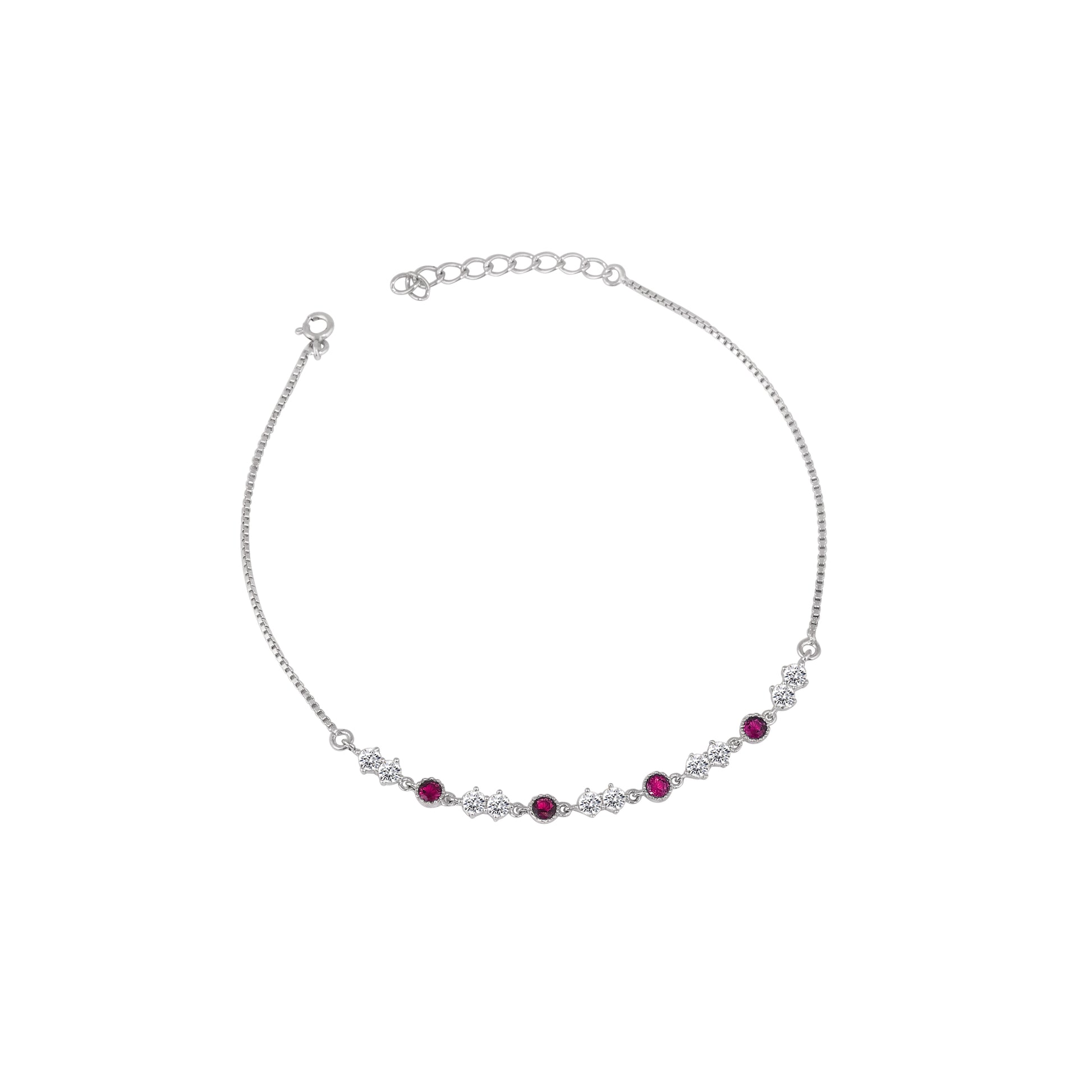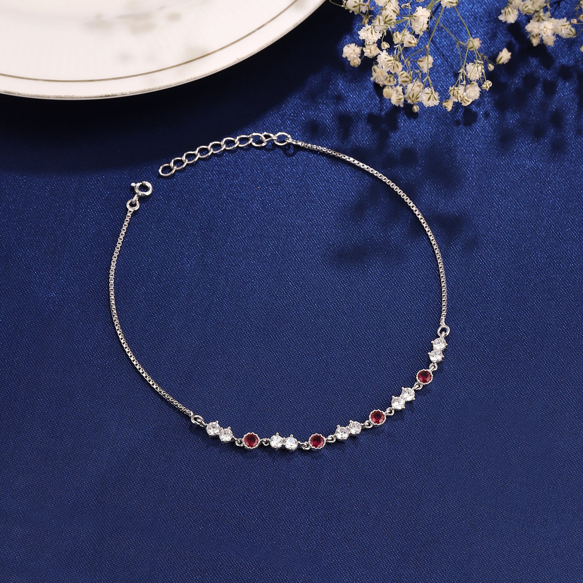 Crafted in premium 925 silver, this beautiful anklet duo features a refined sequence of ruby-red stones paired with shimmering white crystals for a clean and elegant design. The sleek arrangement adds a subtle yet captivating shine, making it perfect for festive looks, casual outfits, or special occasions. With its adjustable chain, it offers a comfortable, secure fit while maintaining a graceful and lightweight feel. Ideal for those who appreciate minimal elegance and timeless ruby charm, this pair is a must-have in any jewellery collection.