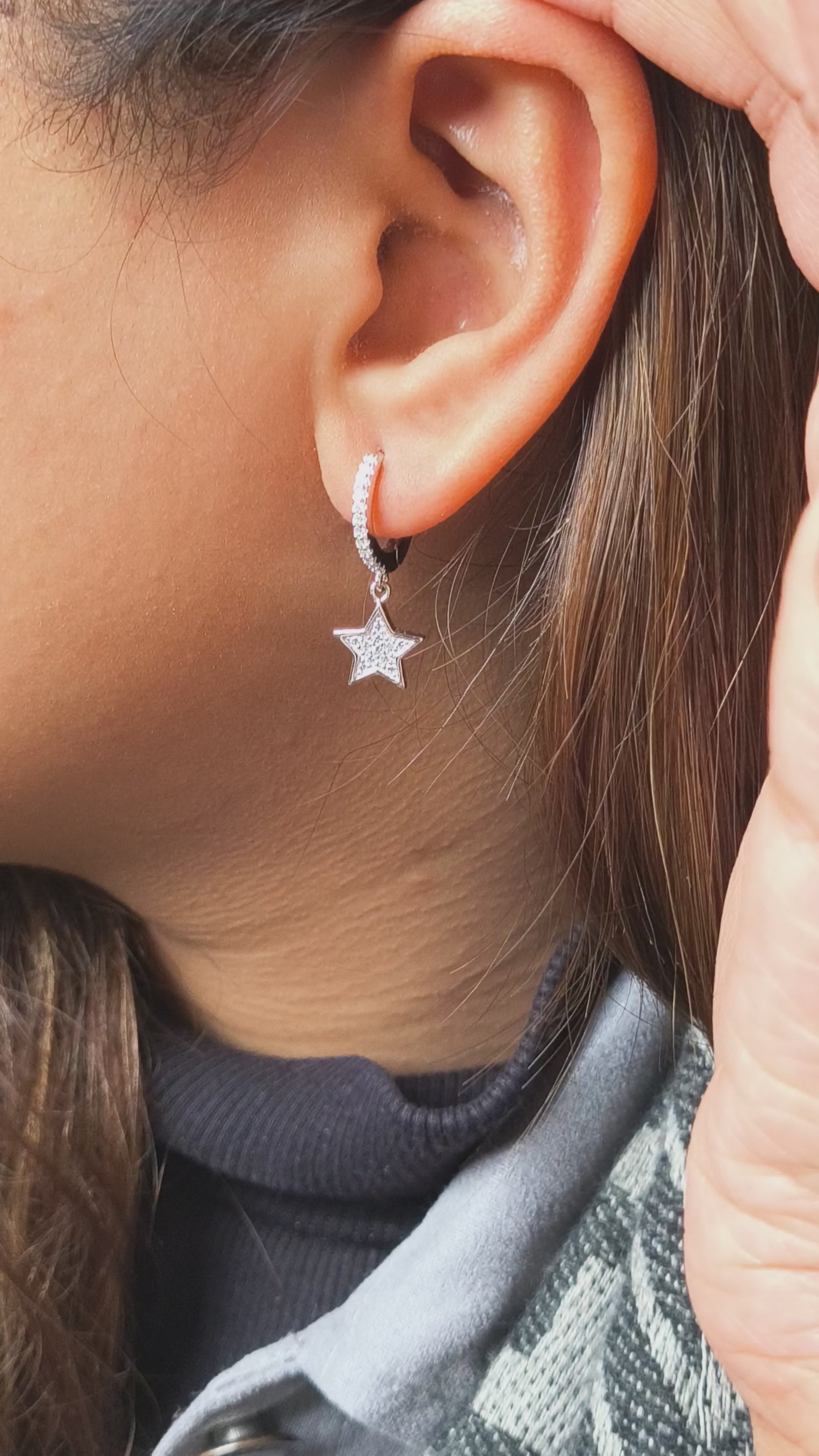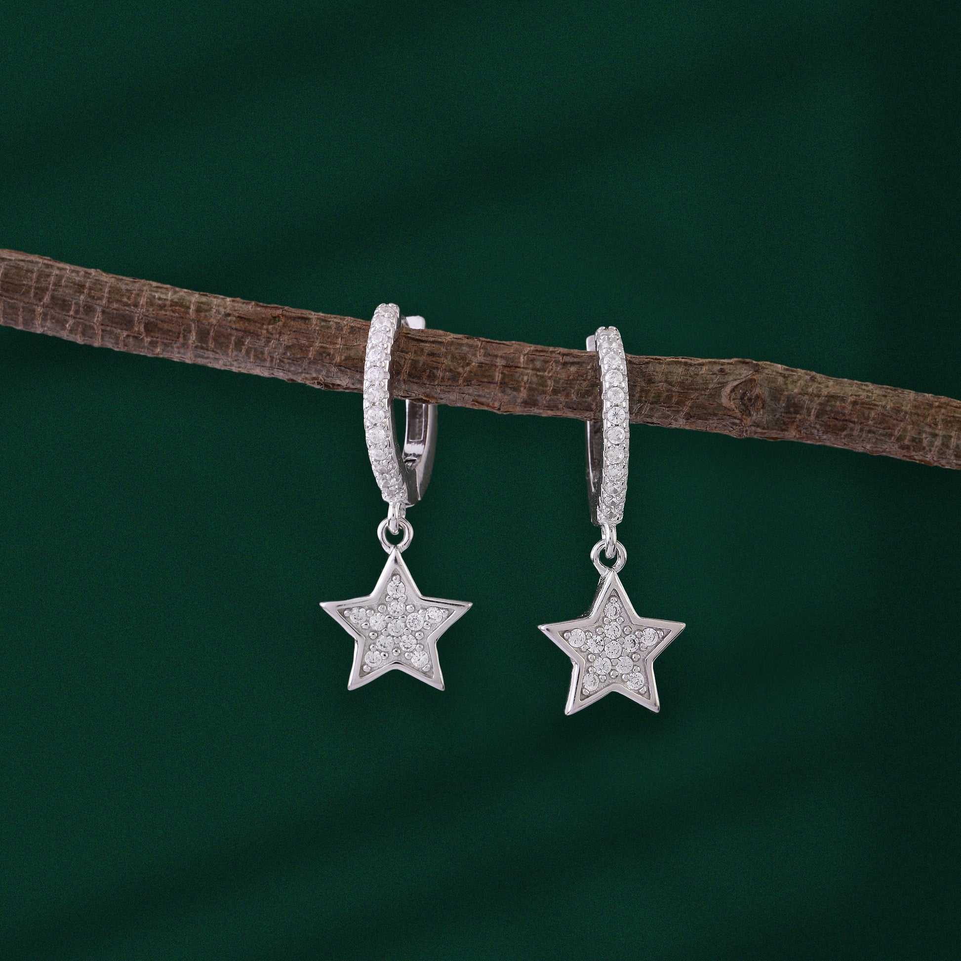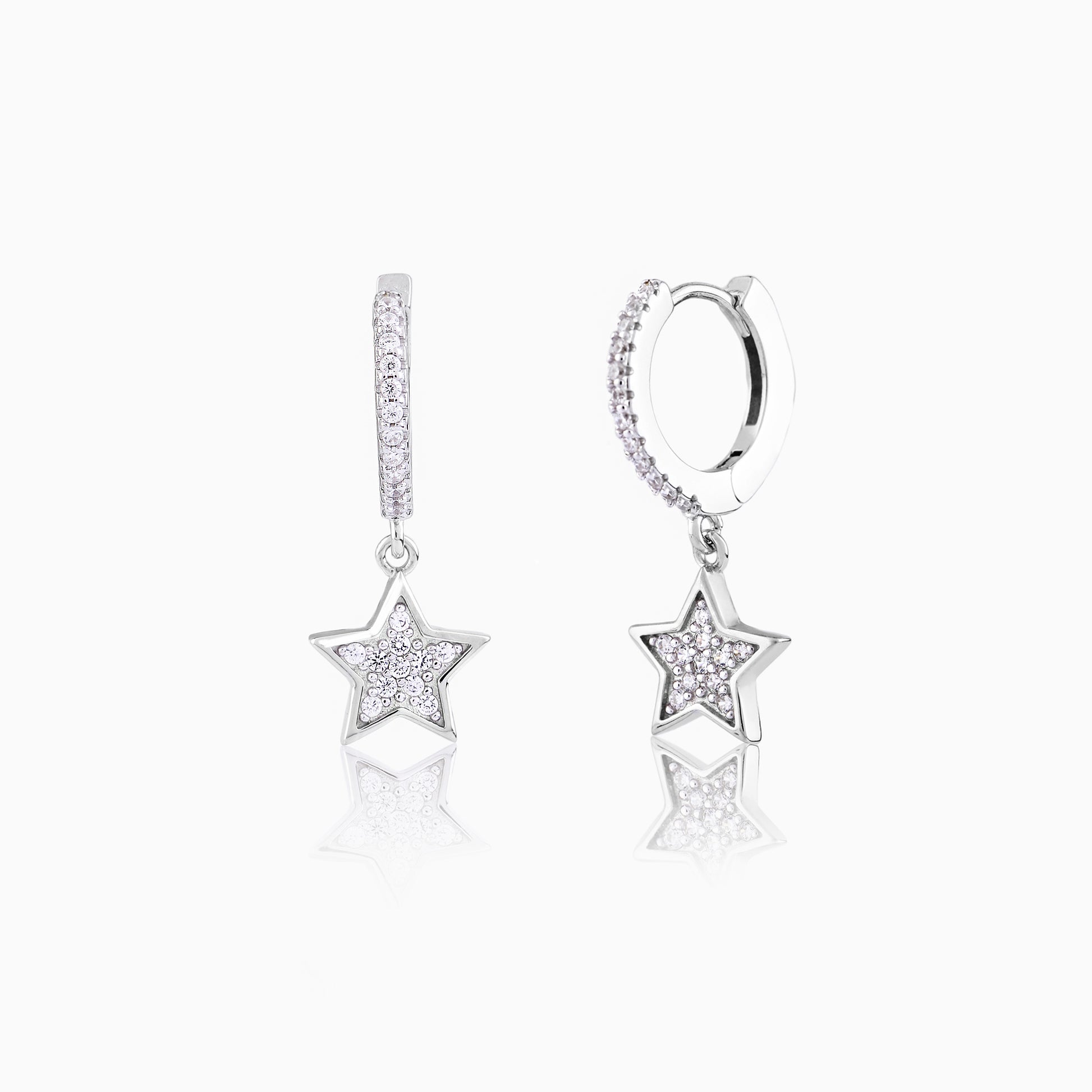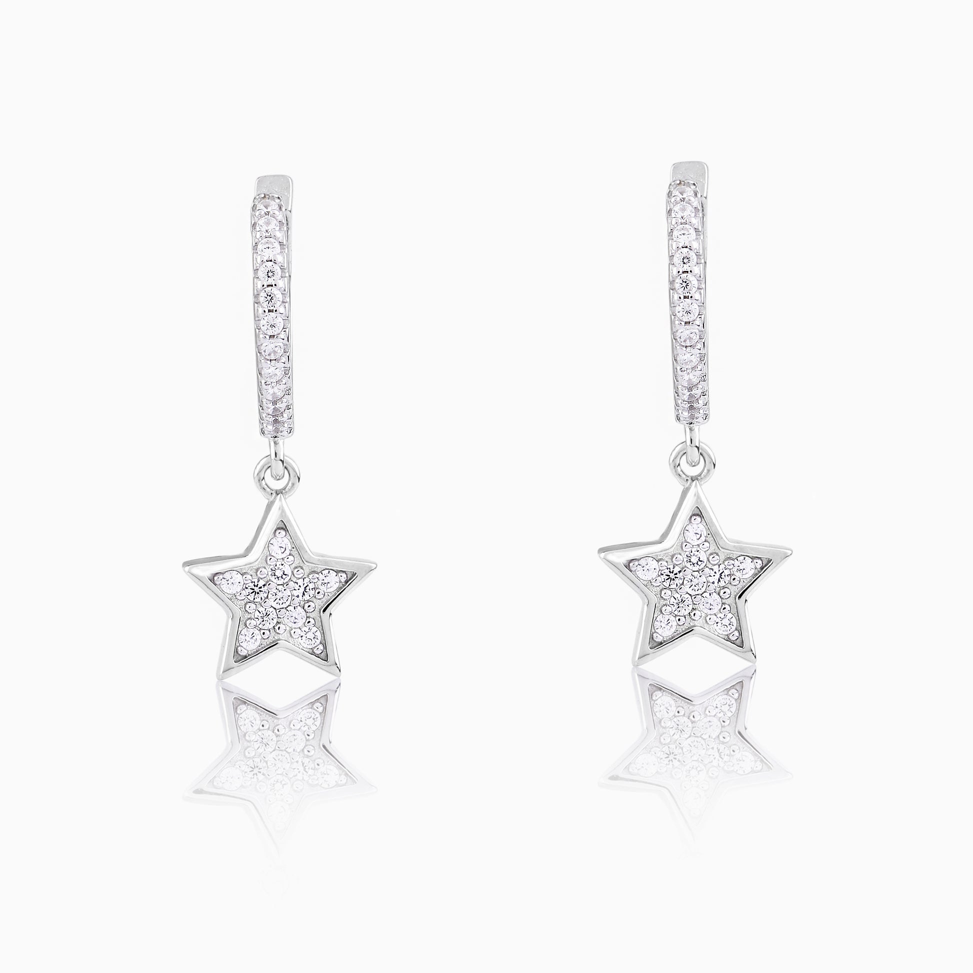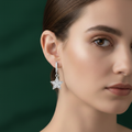These dazzling star dangle earrings are meticulously crafted from genuine 925 silver, suspended from small, pave-set crystal huggie hoops for comfortable, all-day wear. The five-pointed star charm is entirely covered in brilliant, tightly-set crystals, ensuring maximum sparkle with every movement. This glamorous design captures the magic of the night sky, symbolizing ambition and guidance. Perfect for adding a touch of celestial charm to any look, these make an unforgettable gift.