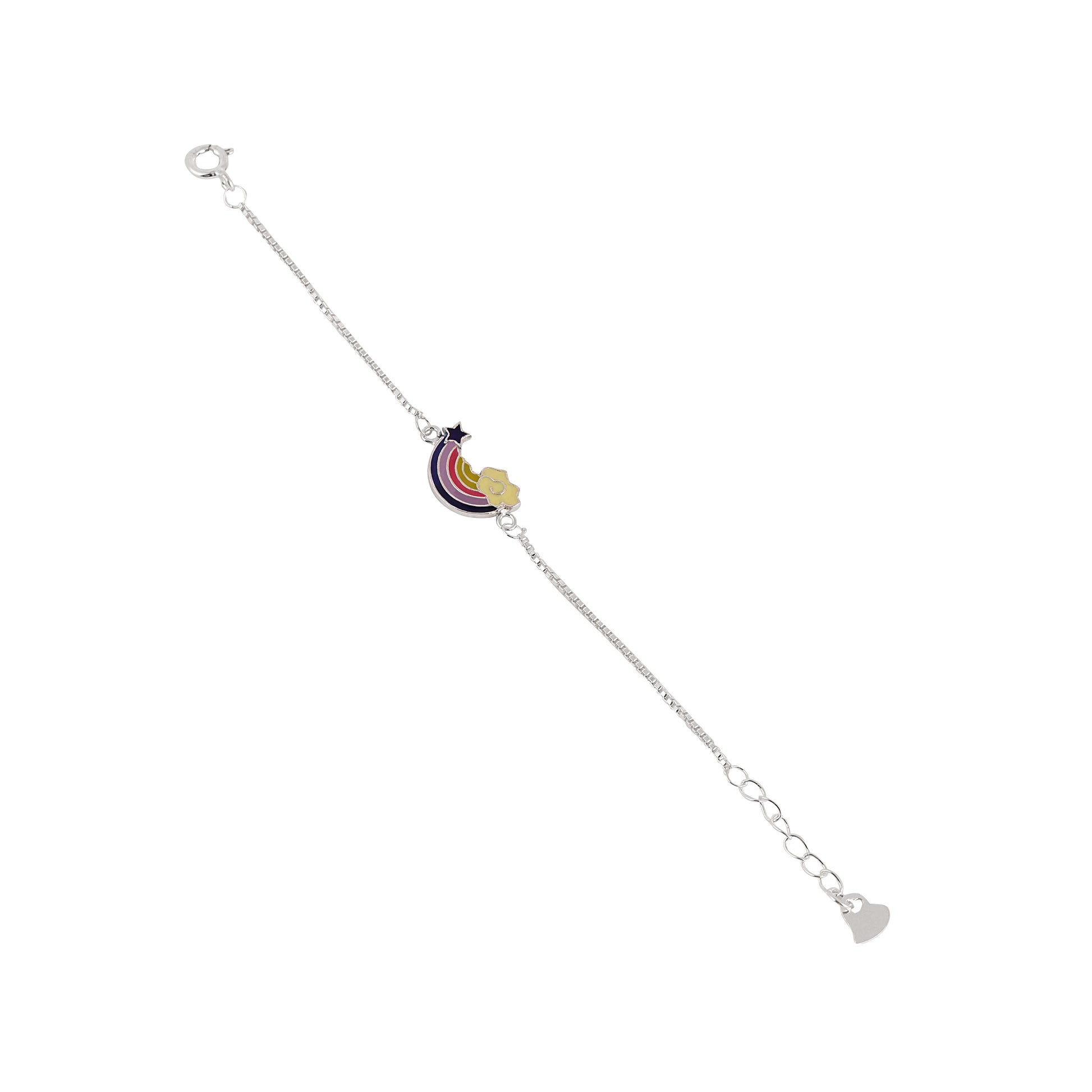 Let your child carry magic wherever they go with this delightful 925 Silver bracelet featuring a colorful rainbow charm and a tiny star and cloud accent. Made to be lightweight, comfortable, and skin-friendly, itβs perfect for everyday sparkle. The adjustable chain ensures a secure fit as your little one grows, keeping it practical and long-lasting.