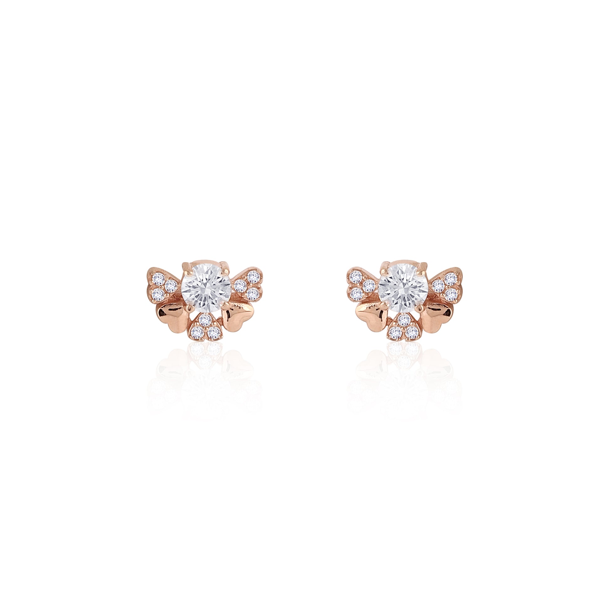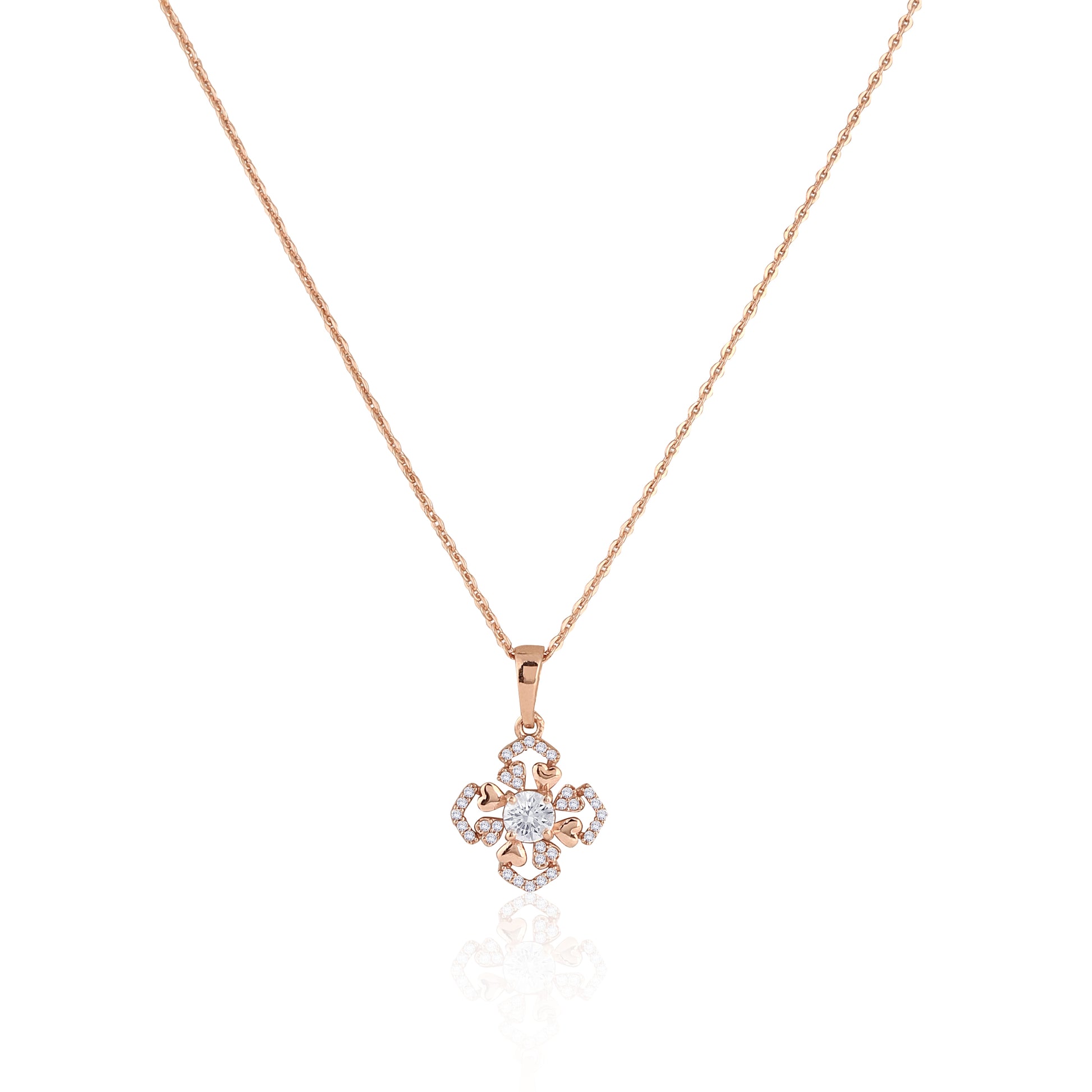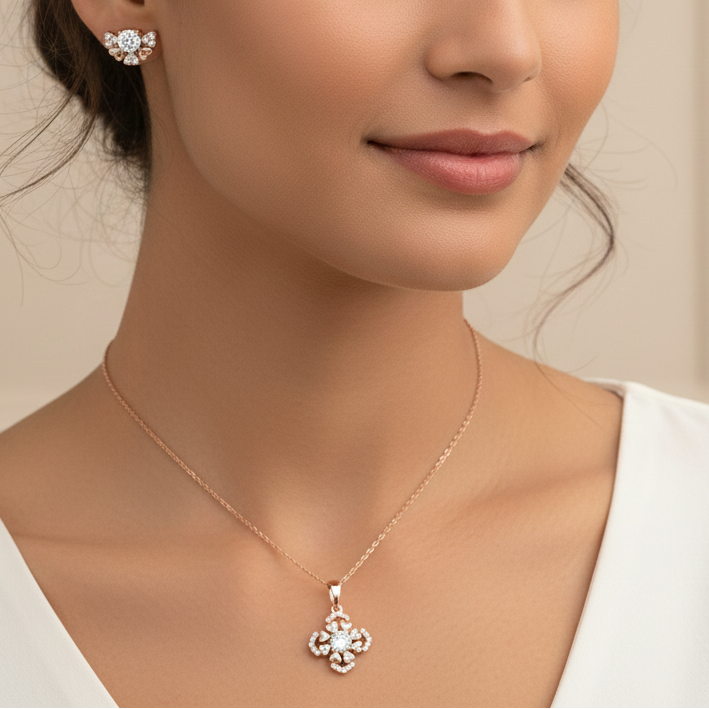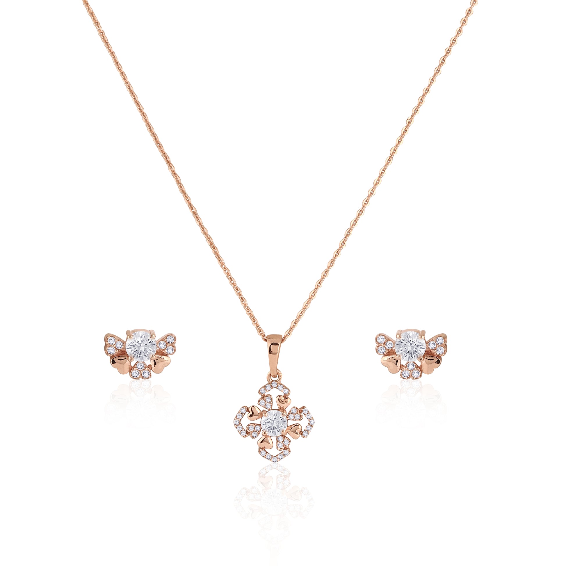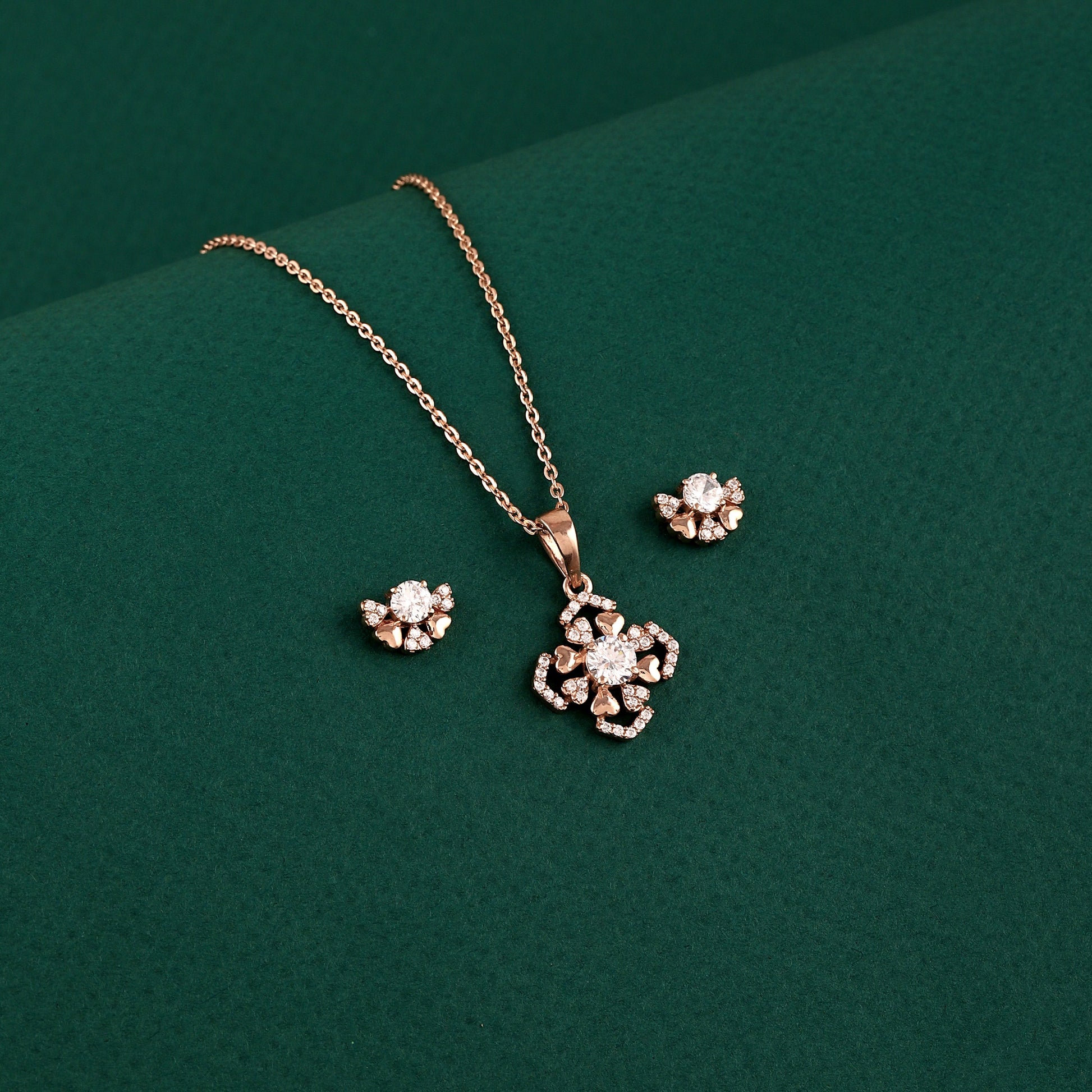 This charming jewelry set features a delicate pendant necklace and matching stud earrings, all finished in a warm Rose Gold plating. The centerpiece of the pendant is an intricate clover or floral design detailed with small, sparkling stones and a center cluster that catches the light beautifully. The matching stud earrings mirror this flower motif. The entire set is crafted in fine 925 Sterling Silver, offering a romantic and feminine sparkle perfect for daily wear or a special gift.
