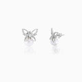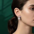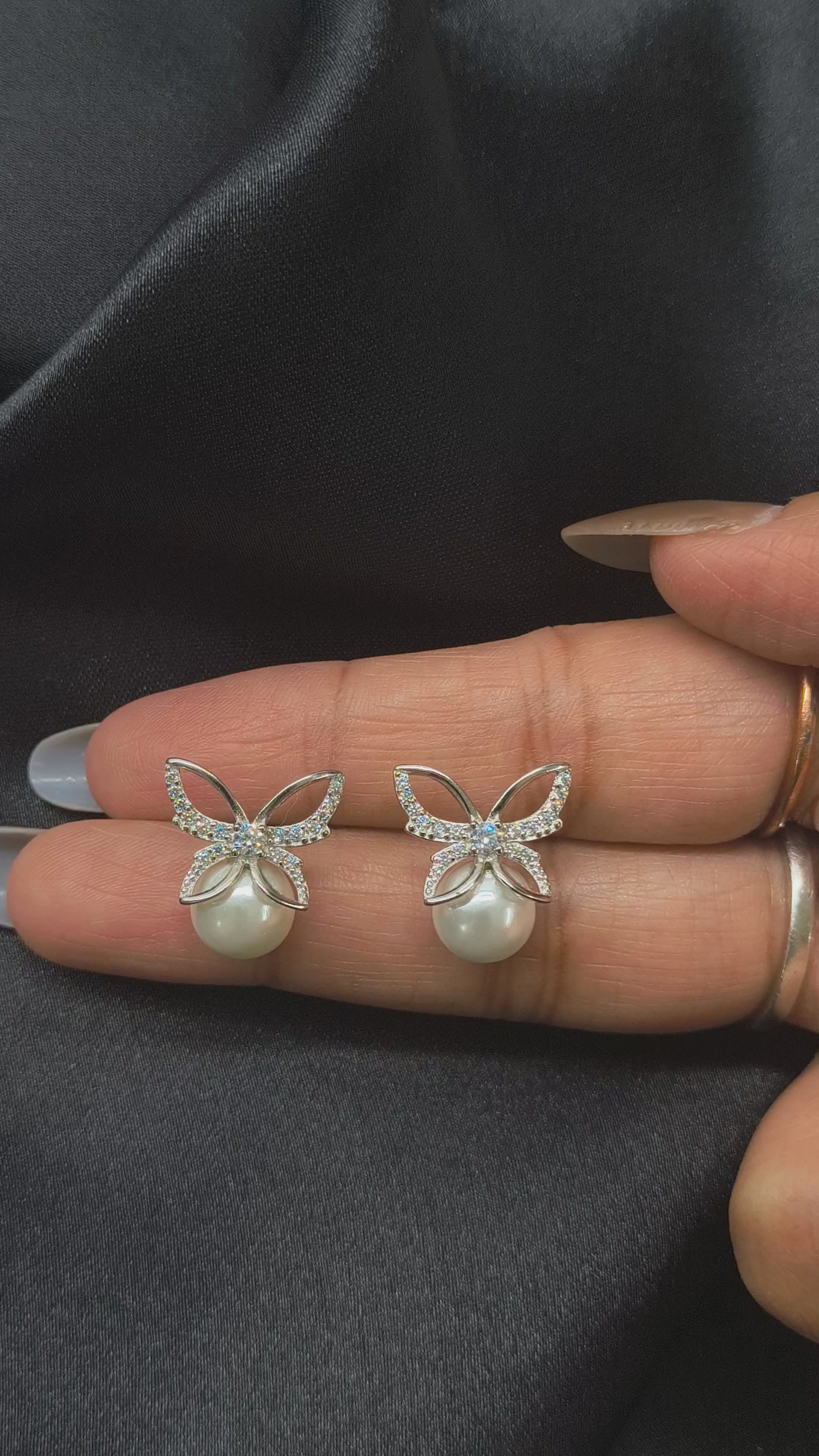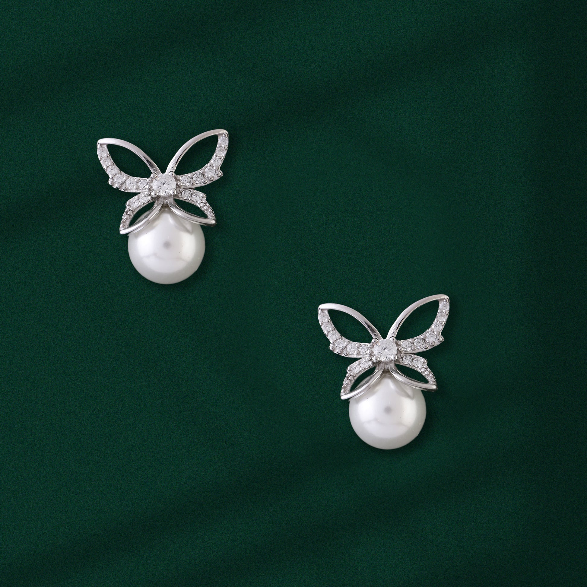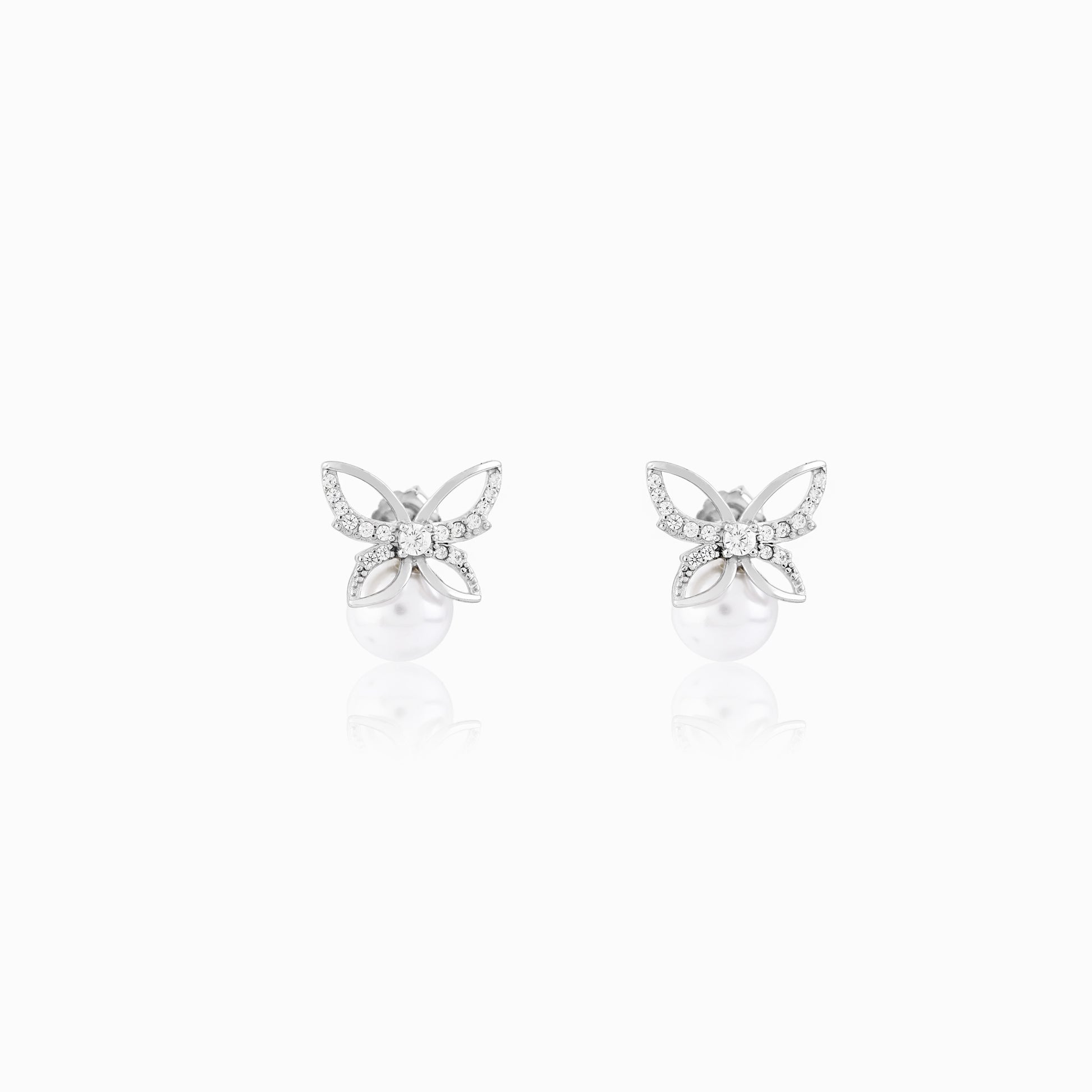 These elegant and luxurious stud earrings are finely crafted in genuine 925 silver, featuring a delicate, open butterfly-style bow design completely set with shimmering pave crystals. Suspended gracefully beneath the crystal bow is a luminous, large round simulated pearl, which adds a classic touch of timeless sophistication. This exquisite pairing of sparkle and iridescence makes them perfect for brides, special occasions, or simply adding chic glamour to your look.