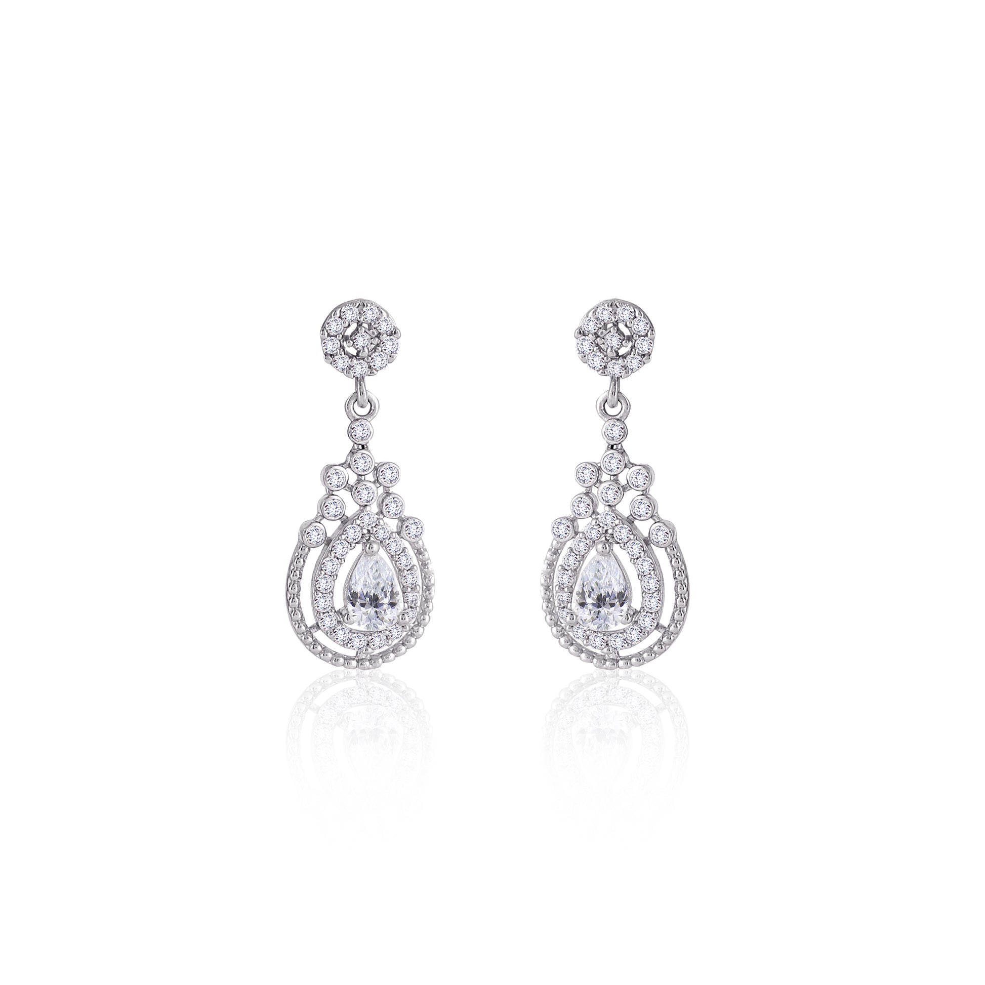 Exude old-world glamour with these exquisitely designed teardrop drop earrings, featuring a brilliant, large pear-shaped cubic zirconia stone surrounded by a delicate pavé halo. The entire structure boasts a stunning filigree-inspired setting that enhances the stone's sparkle and intricate details. Crafted from genuine 925 silver, these earrings offer a luxurious weight and exceptional quality. They are the perfect choice for weddings, galas, or any event where you wish to make an elegant impact.