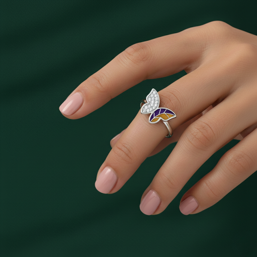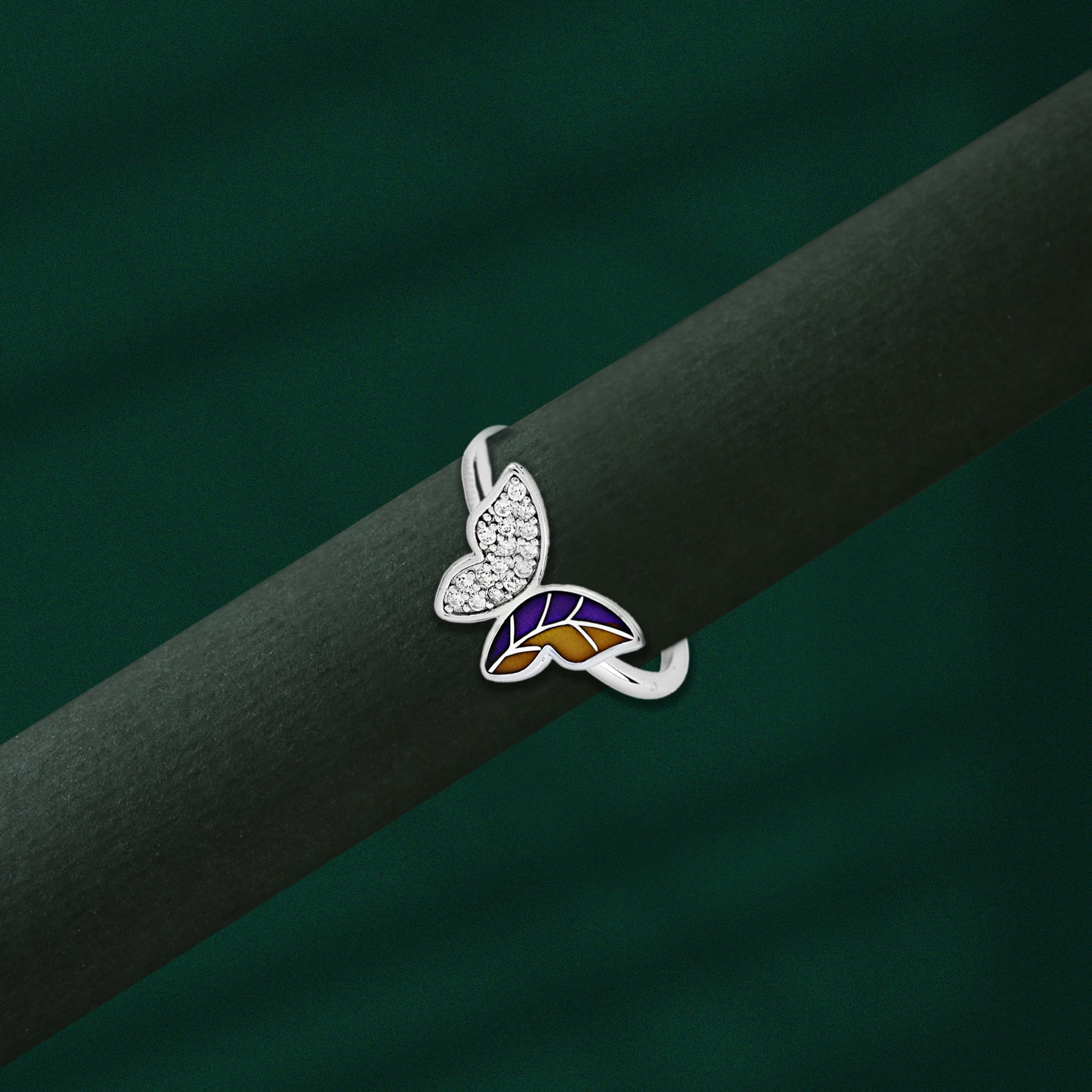 This unique and captivating adjustable 925 silver butterfly ring features a striking contrast, with one wing covered in brilliant, shimmering crystals and the other adorned with deep violet and mustard yellow enamel. The modern, open design allows this piece to gracefully hug the finger, creating a sophisticated yet playful look that catches the light beautifully. Symbolizing individuality and grace, this eye-catching accessory makes a memorable gift for any jewelry lover.