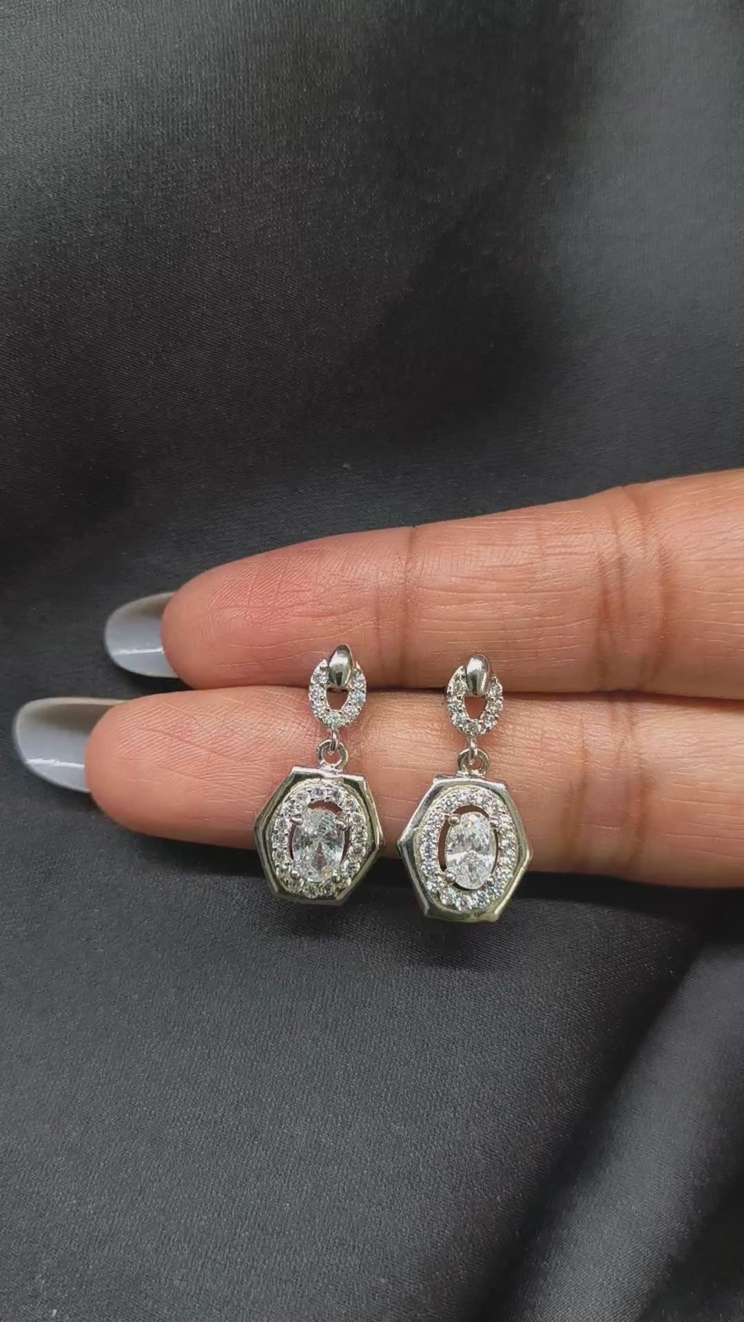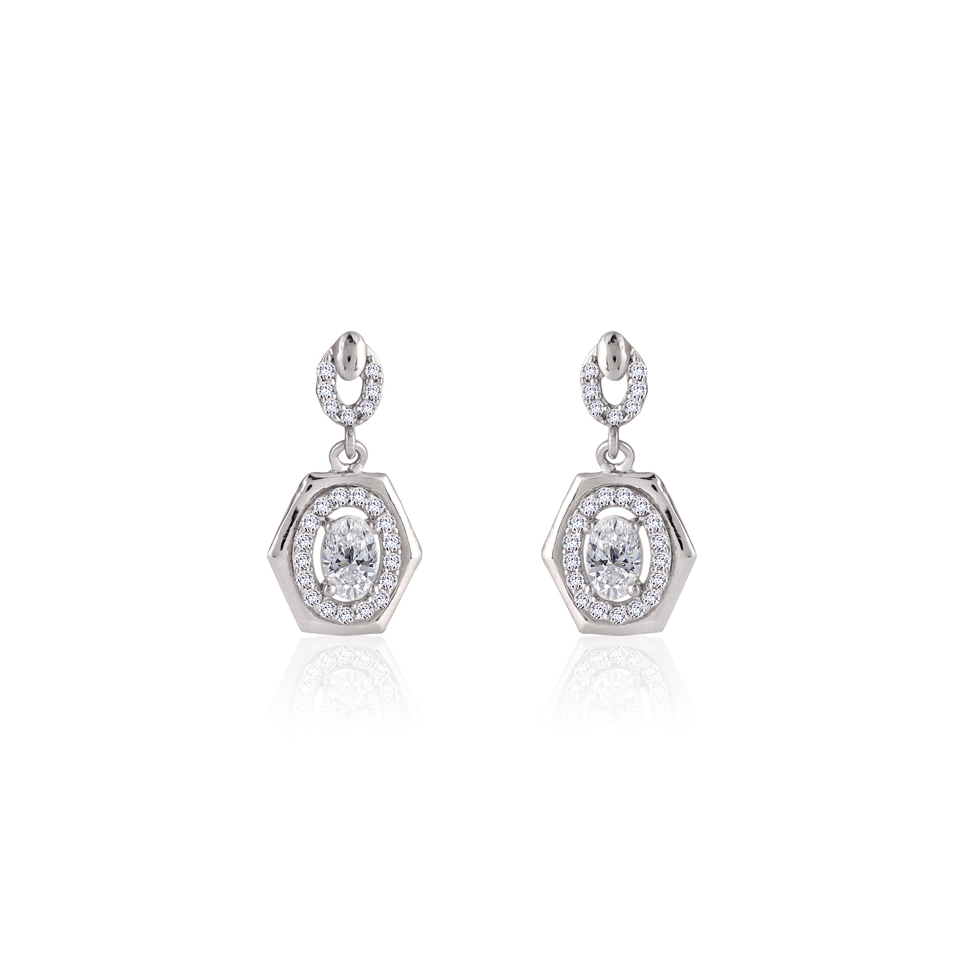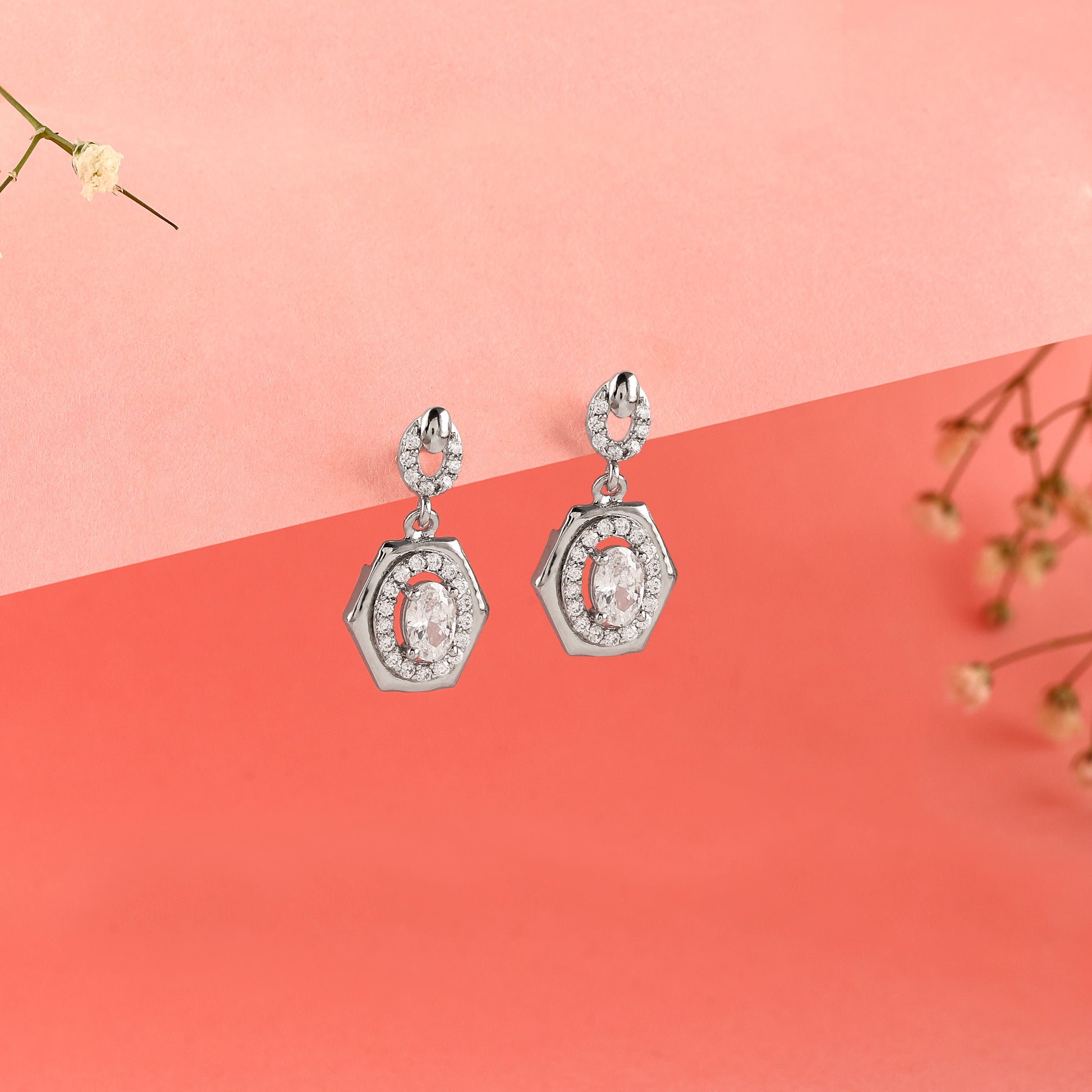 These modern drop earrings feature a chic, geometric design. A brilliant oval-cut center stone is framed by a sparkling pavé halo, which is then enclosed within a bold polished hexagonal frame. The drop is suspended from an accent cluster post. Crafted entirely in high-quality 925 Silver, these earrings combine vintage-inspired sparkle with contemporary lines, making them perfect for stylish everyday wear or a night out.