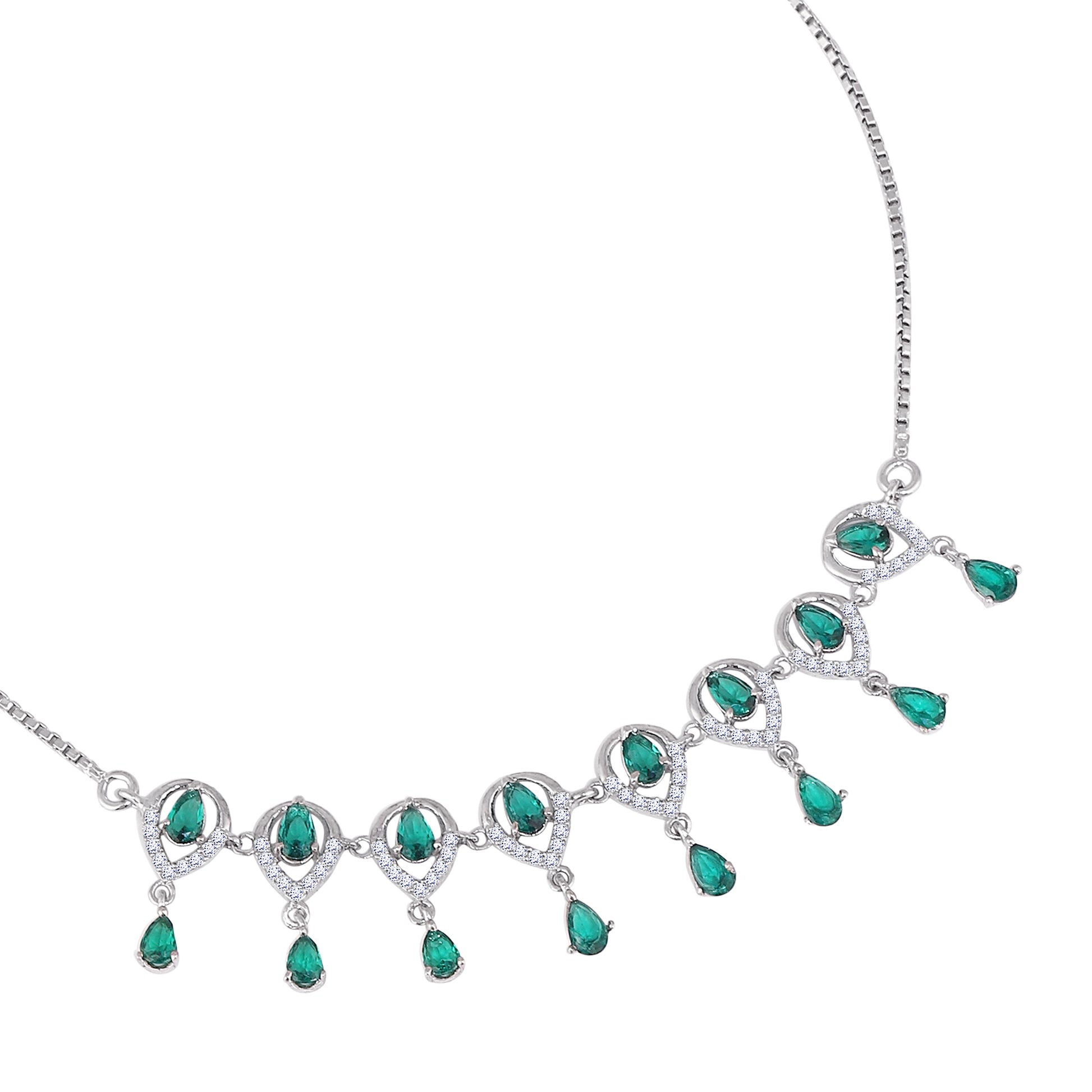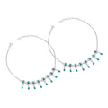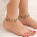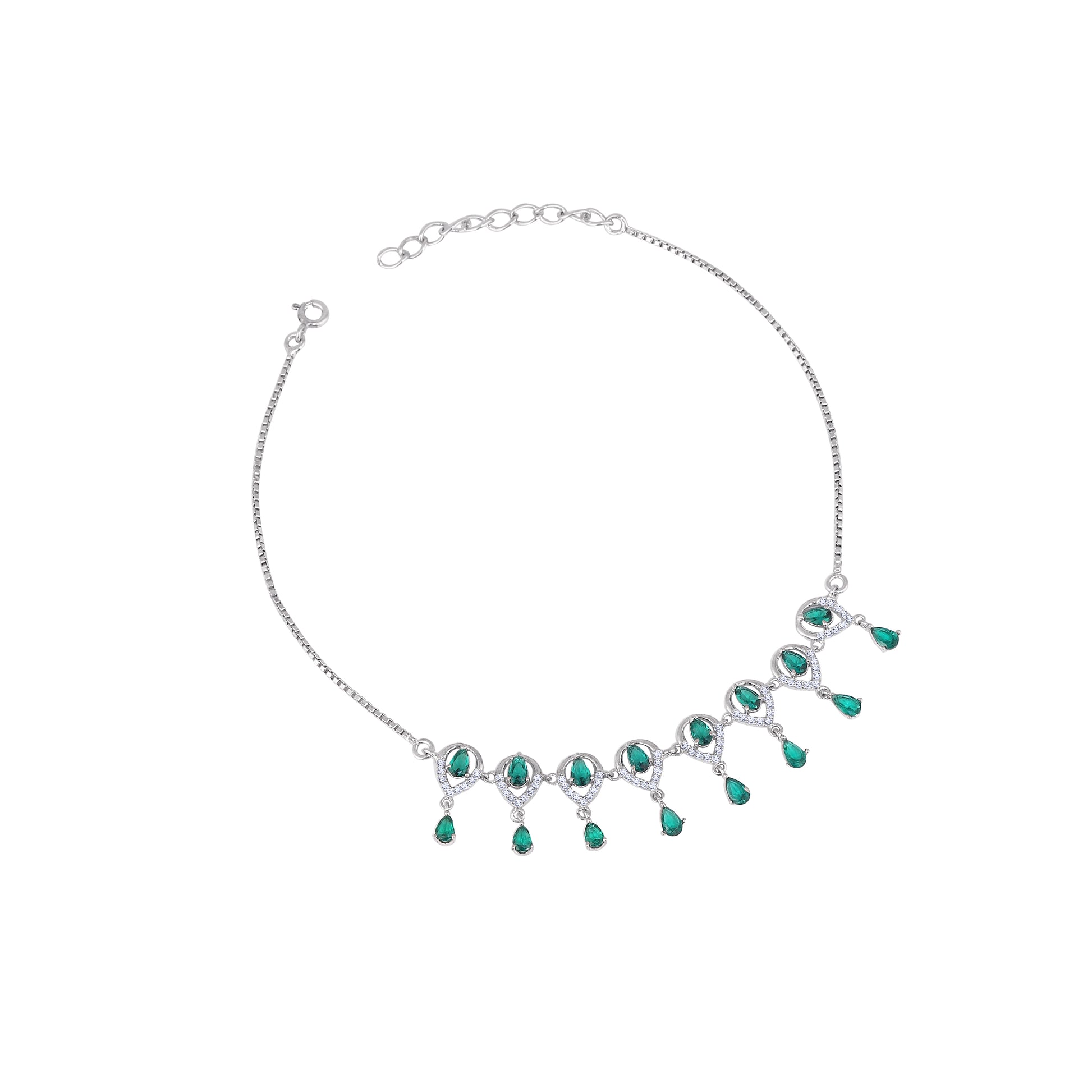 Crafted in premium 925 silver, this elegant anklet set features exquisite teardrop motifs adorned with shimmering emerald-green stones that create a luxurious, eye-catching look. The delicate dangling drops add graceful movement, making every step feel refined and feminine. Designed with an adjustable chain for a perfect fit, this piece blends traditional charm with modern sophistication. A beautiful choice for anyone who loves statement jewellery and timeless emerald elegance.