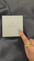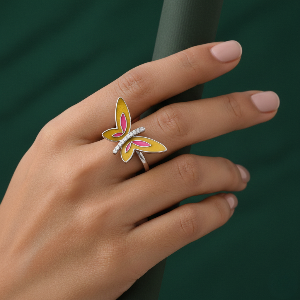 This cheerful and eye-catching adjustable 925 silver butterfly ring is a beautiful statement piece, featuring bold yellow and playful pink enamel wings that are sure to brighten any day. The butterfly's body is elegantly adorned with a delicate row of sparkling crystals, offering a perfect contrast to the colorful enamel work. It symbolizes happiness and new beginnings, making it a wonderful gift or a vibrant addition to your daily wear. The sturdy design ensures this whimsical accessory remains a beloved part of your jewelry collection.