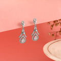 These stunning dangle earrings feature an intricate design inspired by Art Deco glamour. The main drop showcases a brilliant, centrally-placed pear-cut (teardrop) stone surrounded by a sparkling halo. This is suspended below a geometric, tiered arch structure richly adorned with pavé-set stones. Crafted in high-quality 925 Silver, these earrings provide exceptional sparkle and sophisticated movement, perfect for formal events or adding a vintage touch to your evening attire.