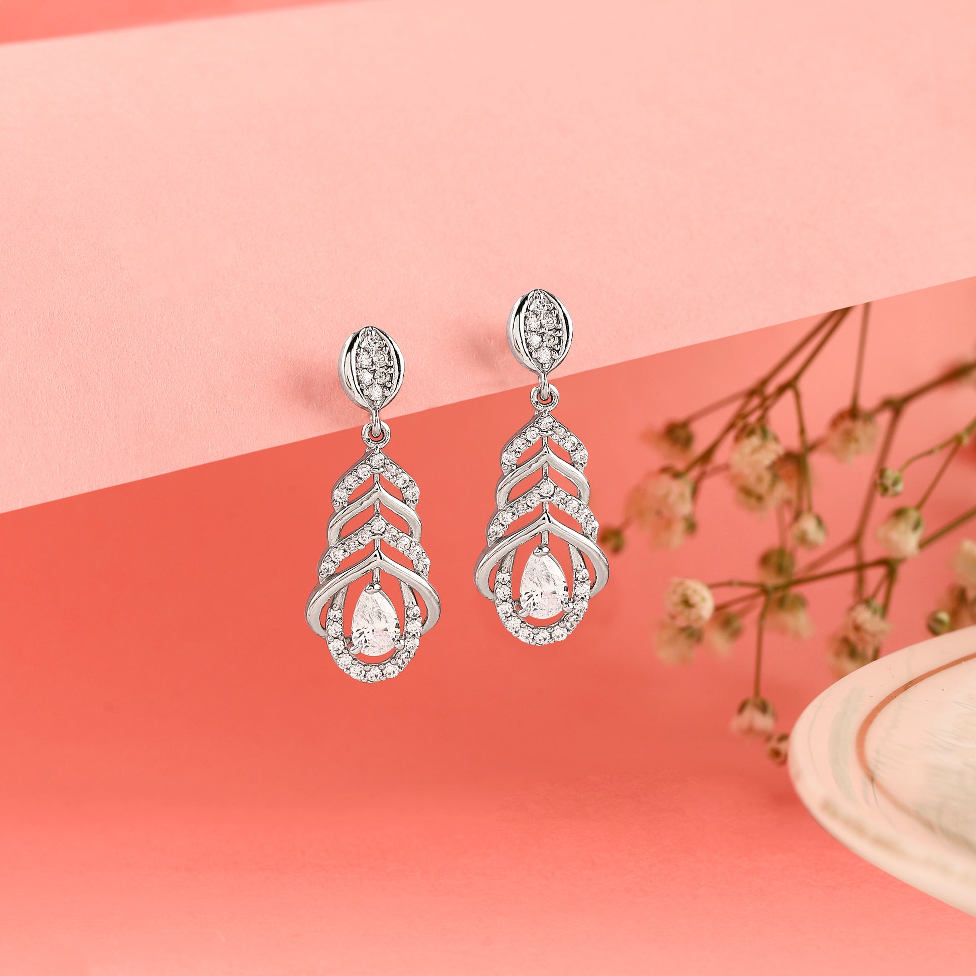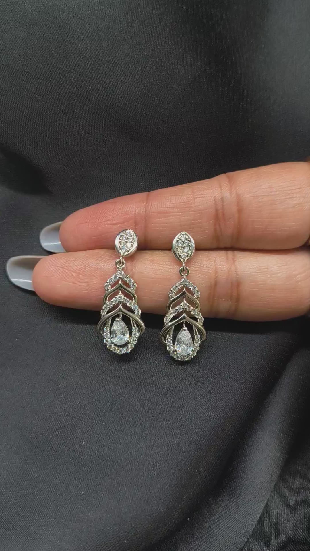 These magnificent drop earrings make an unforgettable statement with their intricate and layered Art Deco-inspired design. They feature shimmering clear cubic zirconia stones set in a beautiful, sweeping, feather-like motif, culminating in a brilliant pear-shaped crystal drop. Crafted from genuine 925 silver, these earrings provide a luxurious weight and enduring shine, making them the perfect accessory to elevate any formal or evening attire with their dramatic sparkle.