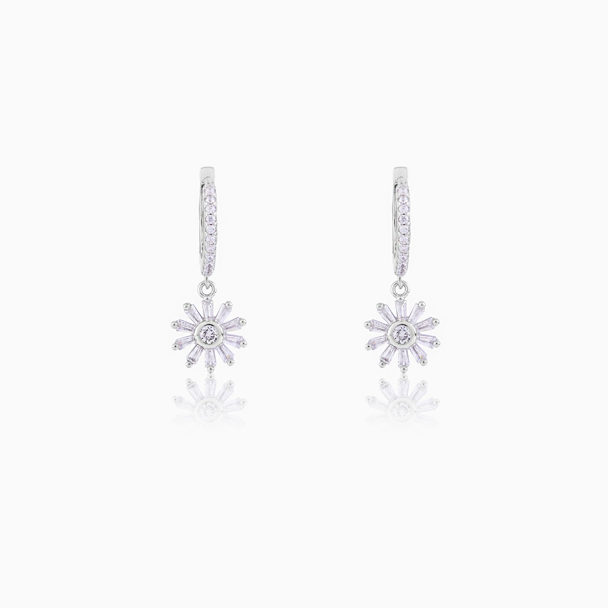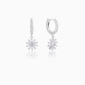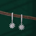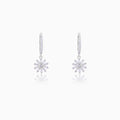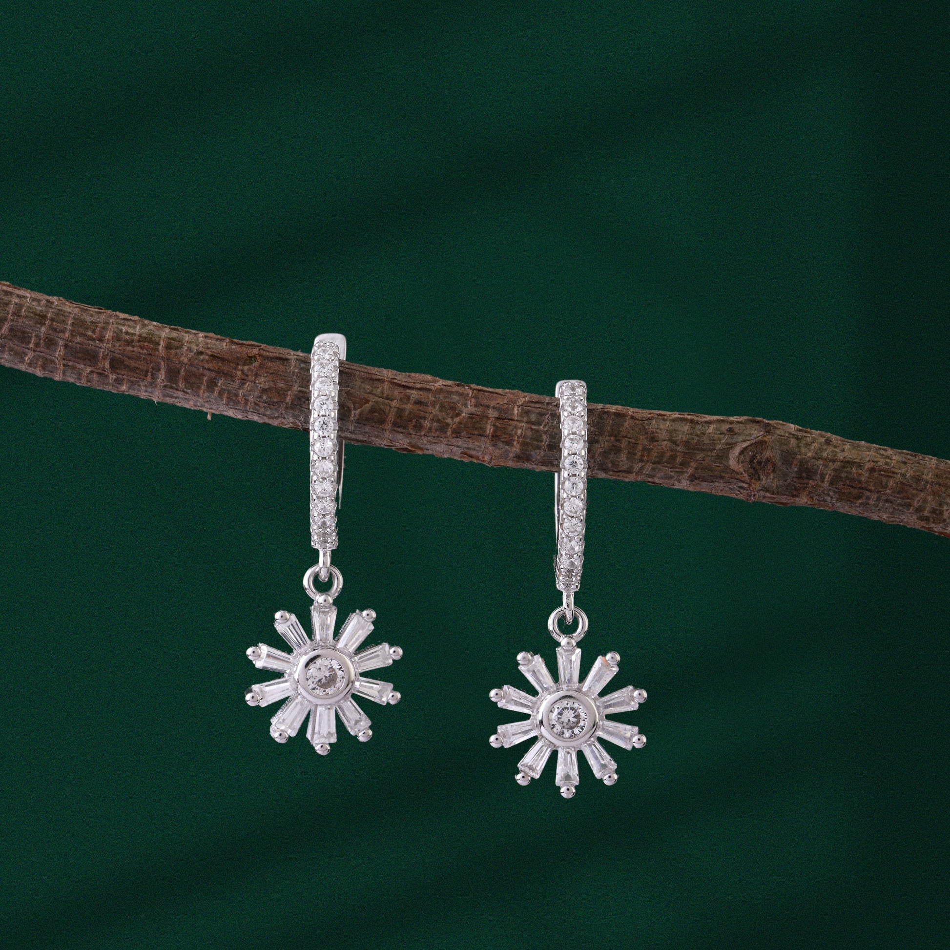 Inspired by the brilliance of the night sky, these dazzling drop 92.5 Silver earrings feature a radiant starburst design suspended from sleek, diamond-encrusted hoops. The centre stone sparkles like a twinkling star, surrounded by baguette and round-cut accents that create a sunray effect. Elegant yet playful, these 92.5 Silver earrings bring a touch of cosmic charm to both festive and everyday looks.