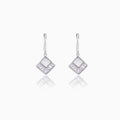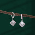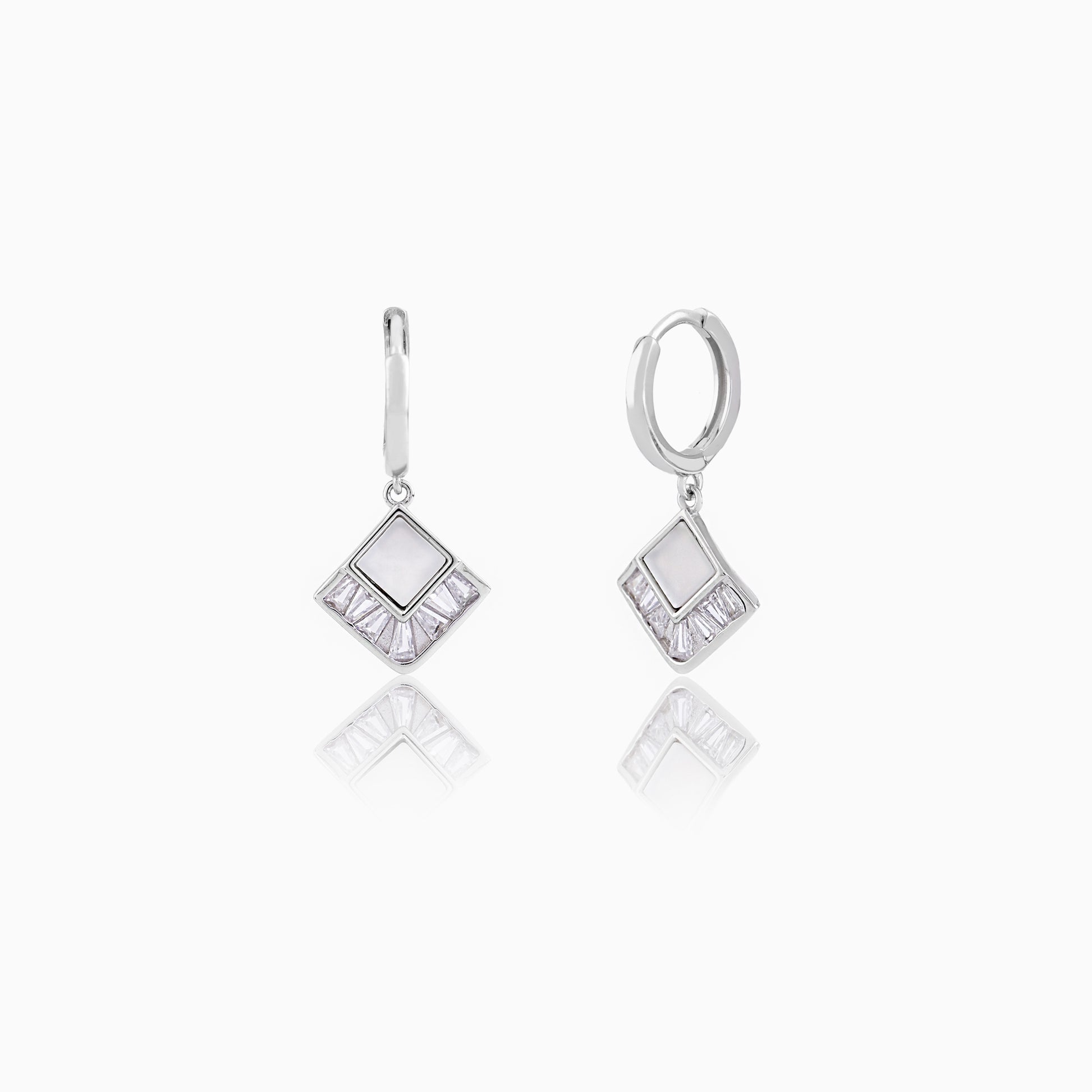 Geometric elegance meets radiant charm in the Crystal Prism Drop Earrings in 92.5 silver. Featuring a diamond-shaped design, these earrings combine a luminous mother-of-pearl center with a dazzling border of baguette-cut crystals, all set in polished silver. Suspended from sleek hoop-style studs, they offer graceful movement and modern refinement — perfect for adding a touch of sophistication to both daywear and evening ensembles