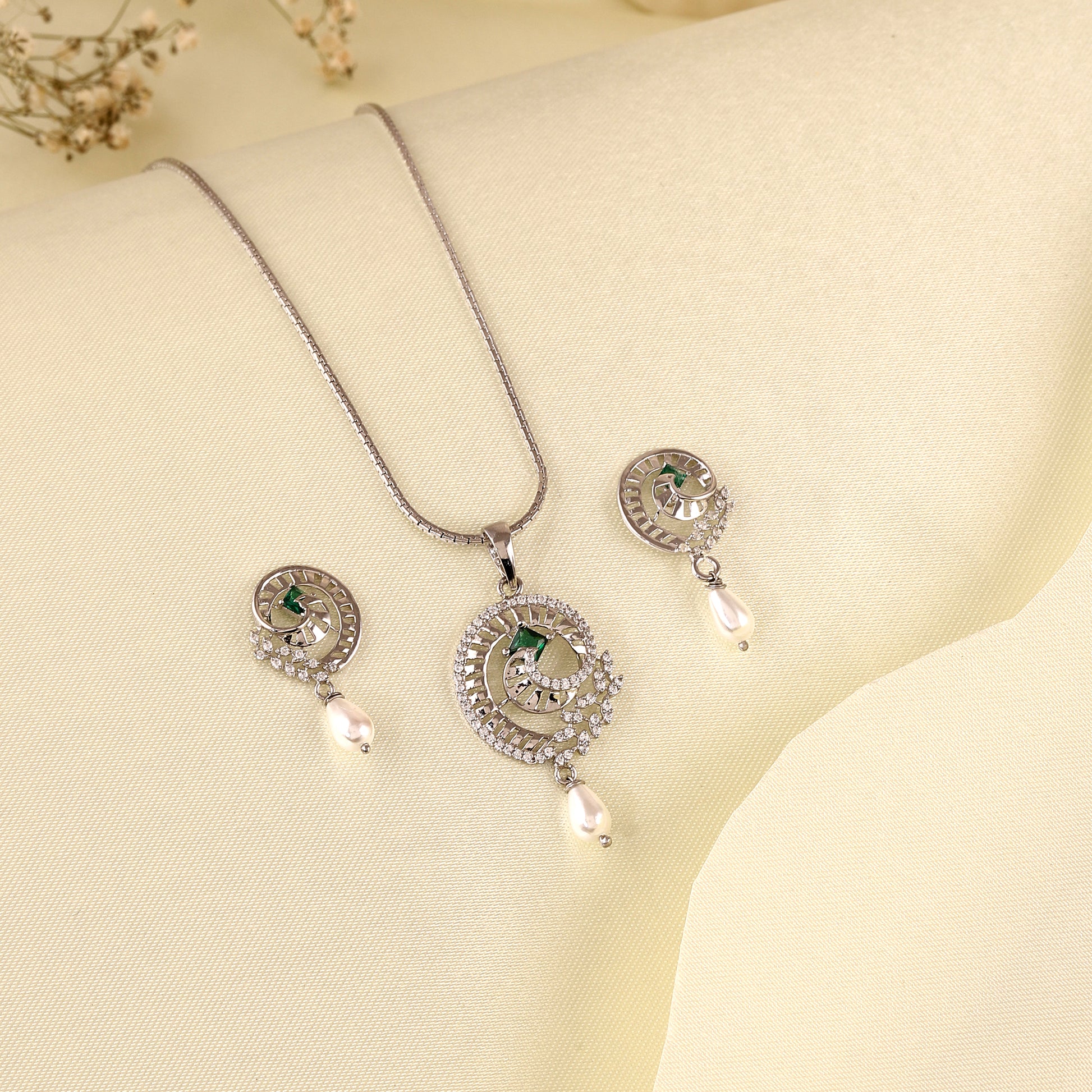 Elevate your style with this 925 silver pendant and earring set, beautifully crafted with a peacock-inspired design. The sparkling CZ stones and delicate pearl drops add a touch of timeless elegance, making it perfect for festive occasions, gifting, or everyday luxury. Made to shine, this set blends intricate detailing with a graceful aesthetic, ensuring you stand out effortlessly.