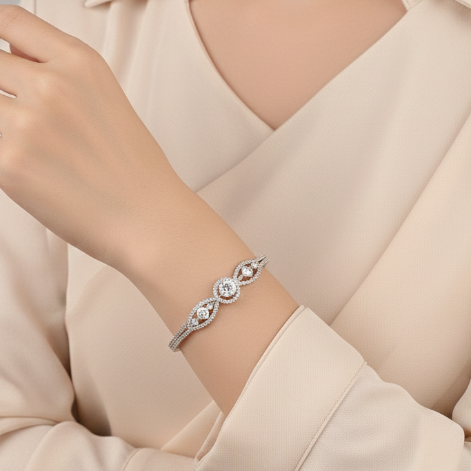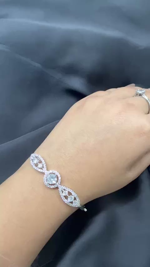 Elevate your look with this exquisite 925 silver bracelet, featuring a stunning centerpiece of brilliant, sparkling cubic zirconia stones. The design showcases an elegant central round stone framed by delicate marquise and circular clusters, creating a timeless, sophisticated aesthetic. Crafted from quality sterling silver, the CZ bracelet offers a luxurious finish and a secure, comfortable fit on the wrist. This dazzling accessory captures the light beautifully, providing the perfect touch of glamour for any formal occasion.