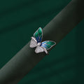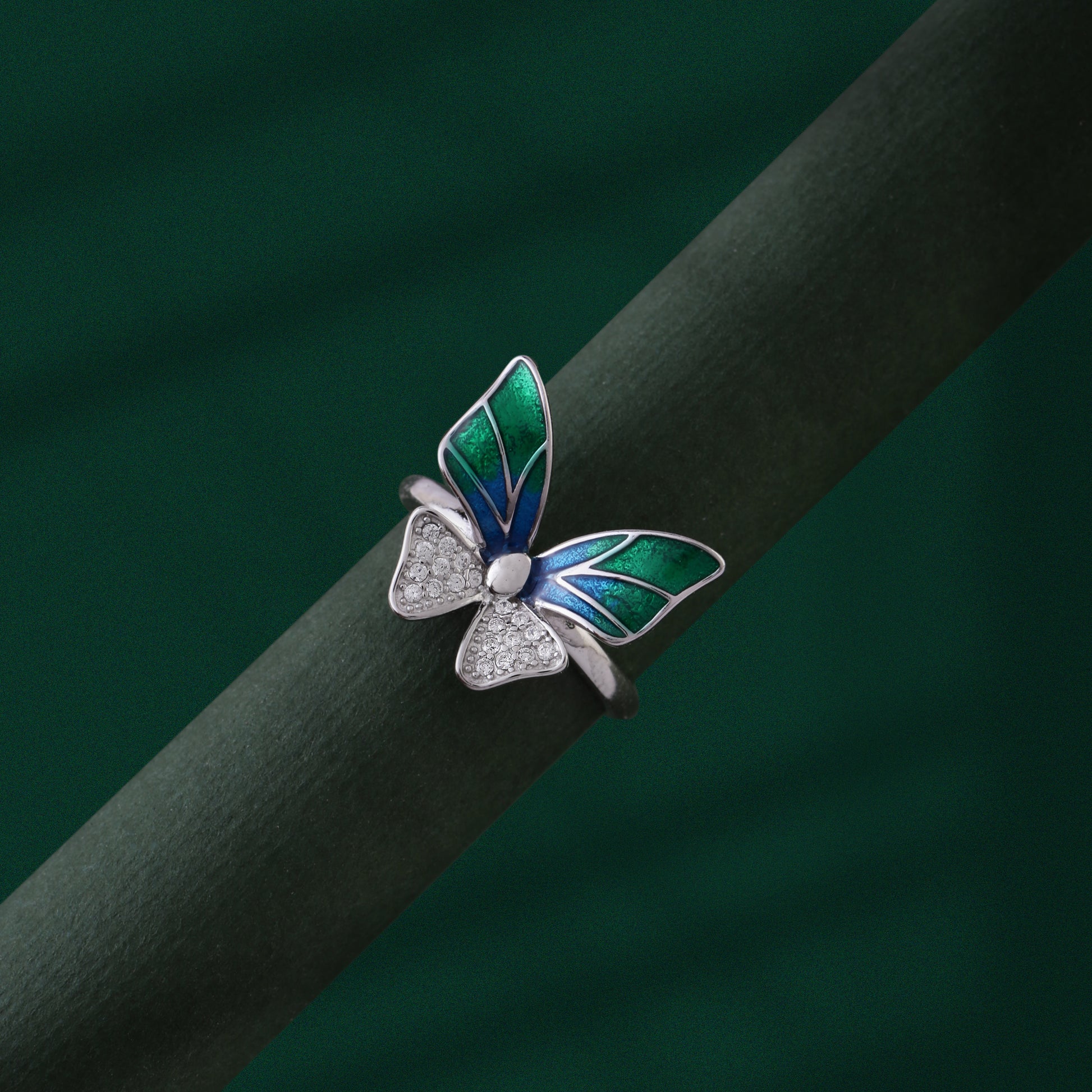 Grace your fingers with the elegance of nature through this stunning Enchanted Wings Butterfly Ring. Crafted in high-quality 925 Silver, the ring features a delicately designed butterfly with shimmering white stones on the lower wings and vivid shades of emerald green and sapphire blue enamel on the upper wings. A symbol of transformation and grace, this ring is perfect for those who love a blend of sparkle and subtle colour in their jewellery collection. Ideal for casual charm or a thoughtful gift.
