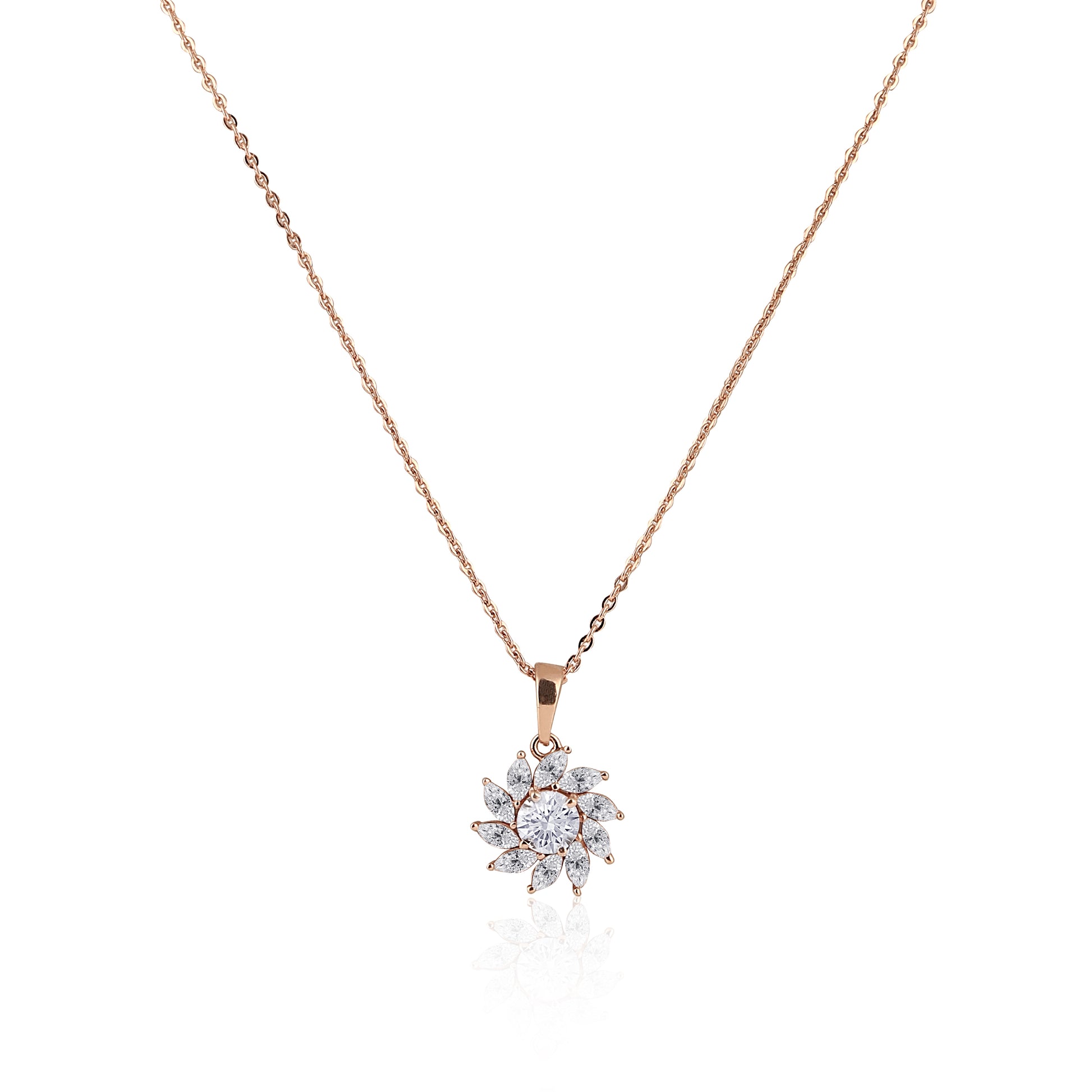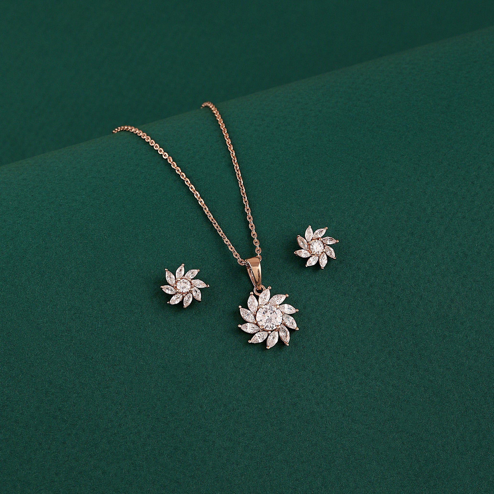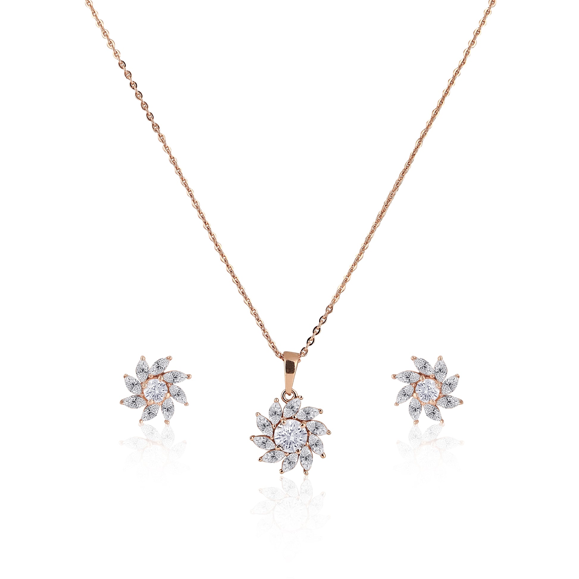 Add a touch of elegance with this stunning floral pendant and earring set, beautifully crafted in pure 925 sterling silver. Designed with sparkling CZ stones in a petal bloom pattern, this lightweight jewellery set is perfect for daily wear, party wear, or gifting. The rose-gold polish enhances its charm, making it a must-have for your silver jewellery collection. A premium 925 silver jewellery piece that brings effortless grace and shine to every outfit.