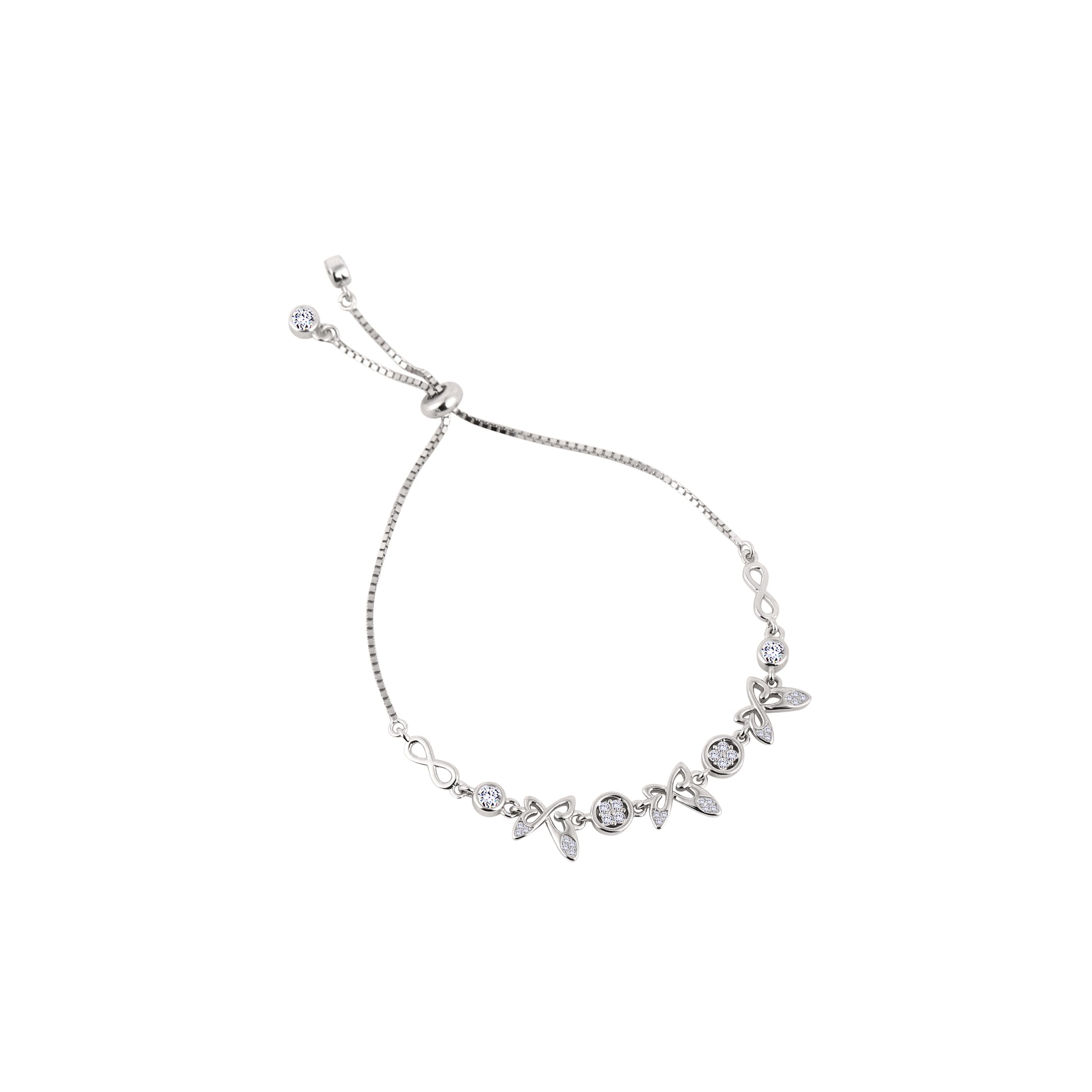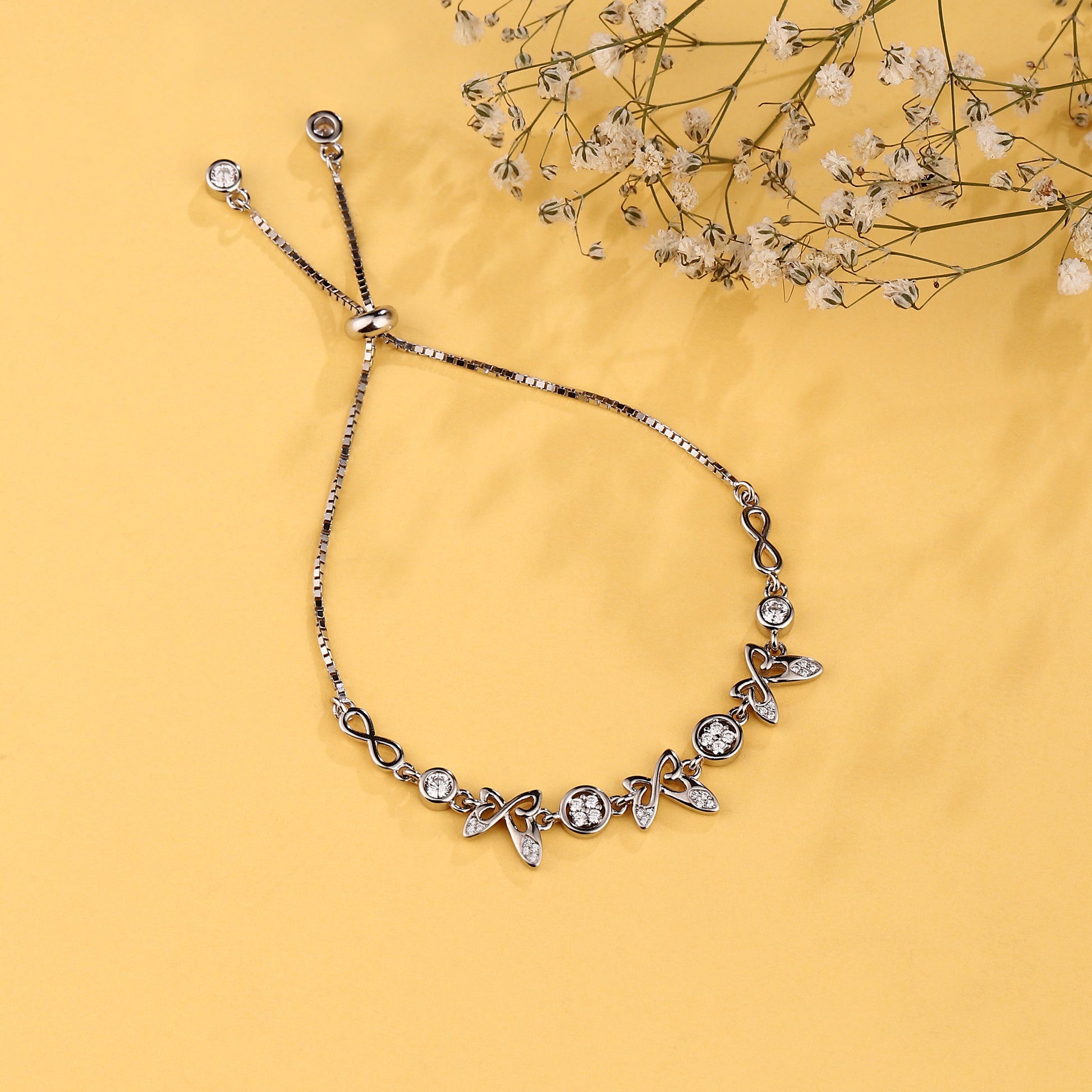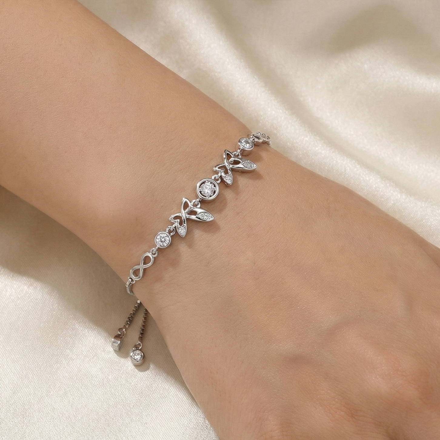 Adorn your wrist with the Fluttering Grace Bolo Bracelet, a whimsical yet elegant tribute to the beauty of flight. Expertly fashioned from authentic 925 silver, this adjustable bracelet features an alternating array of delicate butterfly charms and shimmering circular accents, each set with brilliant pavé stones. Interwoven infinity symbols complete the design, representing eternal transformation and grace. The adjustable slider mechanism allows for a tailored fit on any wrist, while the tarnish-resistant silver ensures a lasting, radiant glow.