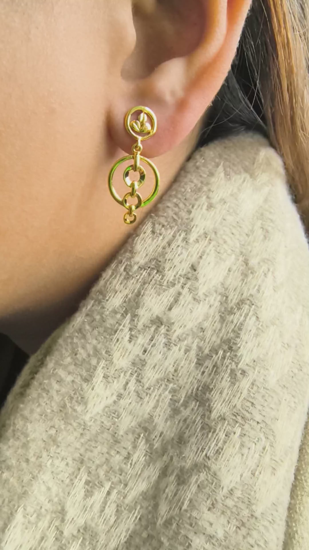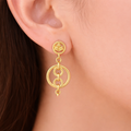 The Golden Harmony Earrings are a perfect fusion of elegance and modern artistry, crafted in premium sterling silver with a lustrous gold finish. Featuring interlinked circular motifs paired with a delicate floral accent at the top, these earrings symbolize balance and unity. Their versatile drop design makes them suitable for both everyday sophistication and special occasions, adding a refined touch of charm to any outfit.