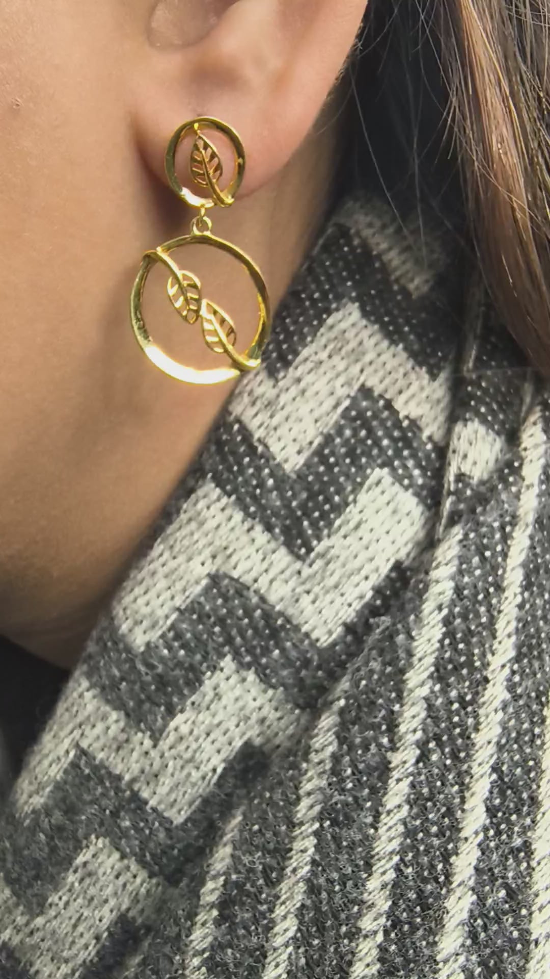 The Golden Leaf Circle Earrings are an elegant ode to nature, crafted in sterling silver with a radiant gold finish. Featuring delicately carved leaf motifs encased within graceful circular frames, these earrings bring together organic charm and modern sophistication. Lightweight and versatile, they make a perfect accessory for everyday wear or to complement festive and formal outfits with a touch of timeless elegance.