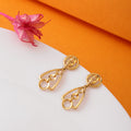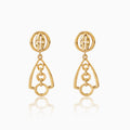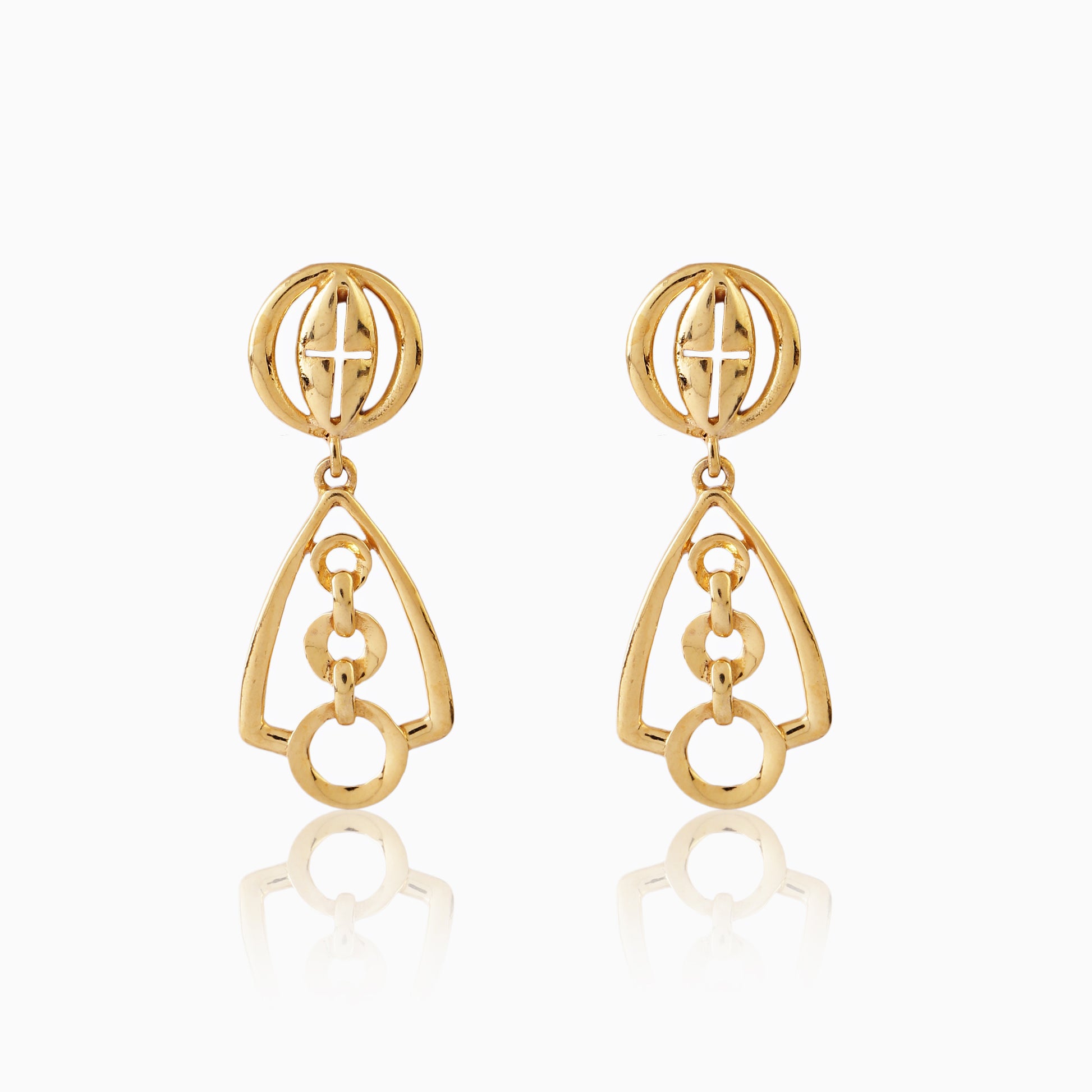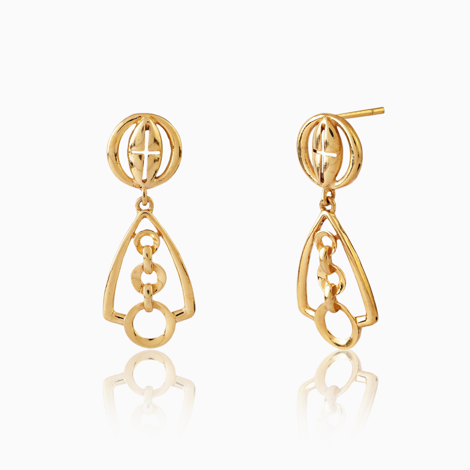 Step into a world of modern elegance with the Golden Orbit Sterling Silver Earrings. Expertly crafted from 925 sterling silver and polished with a radiant gold finish, these earrings feature a unique dome-shaped stud paired with a triangular drop and interlinked circular motifs. The geometric design symbolizes harmony and balance, making them an ideal accessory for both contemporary and traditional ensembles. Lightweight yet striking, they are perfect for adding a statement touch to any outfit.