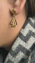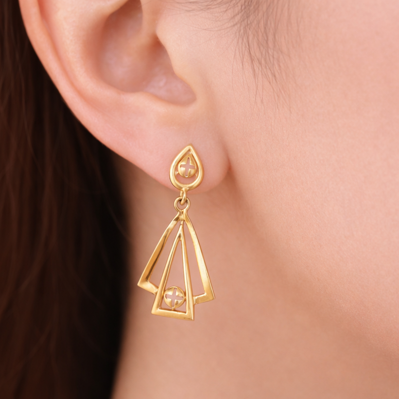 The Golden Prism Earrings are a striking blend of geometric elegance and contemporary design. Crafted from premium sterling silver with a radiant gold finish, these earrings feature triangular open frames accented with delicate circular motifs for a modern architectural touch. Their bold yet lightweight structure makes them perfect for those who love to make a stylish statement, whether paired with chic casuals or evening wear.