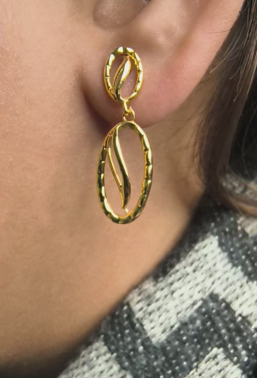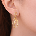 The Golden Wave Earrings are a graceful expression of fluid elegance, crafted from sterling silver with a radiant gold finish. Designed with elongated oval frames and flowing wave-like motifs, they symbolize movement and harmony. The textured detailing on the borders adds a touch of sophistication, making them perfect for both everyday wear and special occasions. Lightweight yet striking, these earrings bring a timeless charm to any look