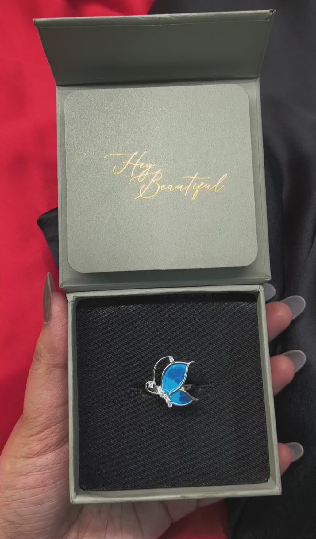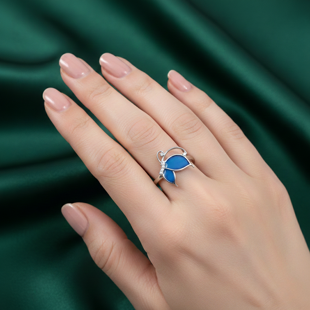 This striking butterfly ring features a bold, open design with wings filled in a vibrant split of bright red and deep blue enamel, creating a captivating contrast. Crafted from high-quality 925 silver, this spirited accessory is accented with shimmering cubic zirconia stones along the butterfly's body for an added touch of sparkle. The comfortable, sleek band and unique color combination make this piece a standout choice for adding personality to any outfit. This charming ring is a perfect gift for anyone who loves bold, colorful jewelry.