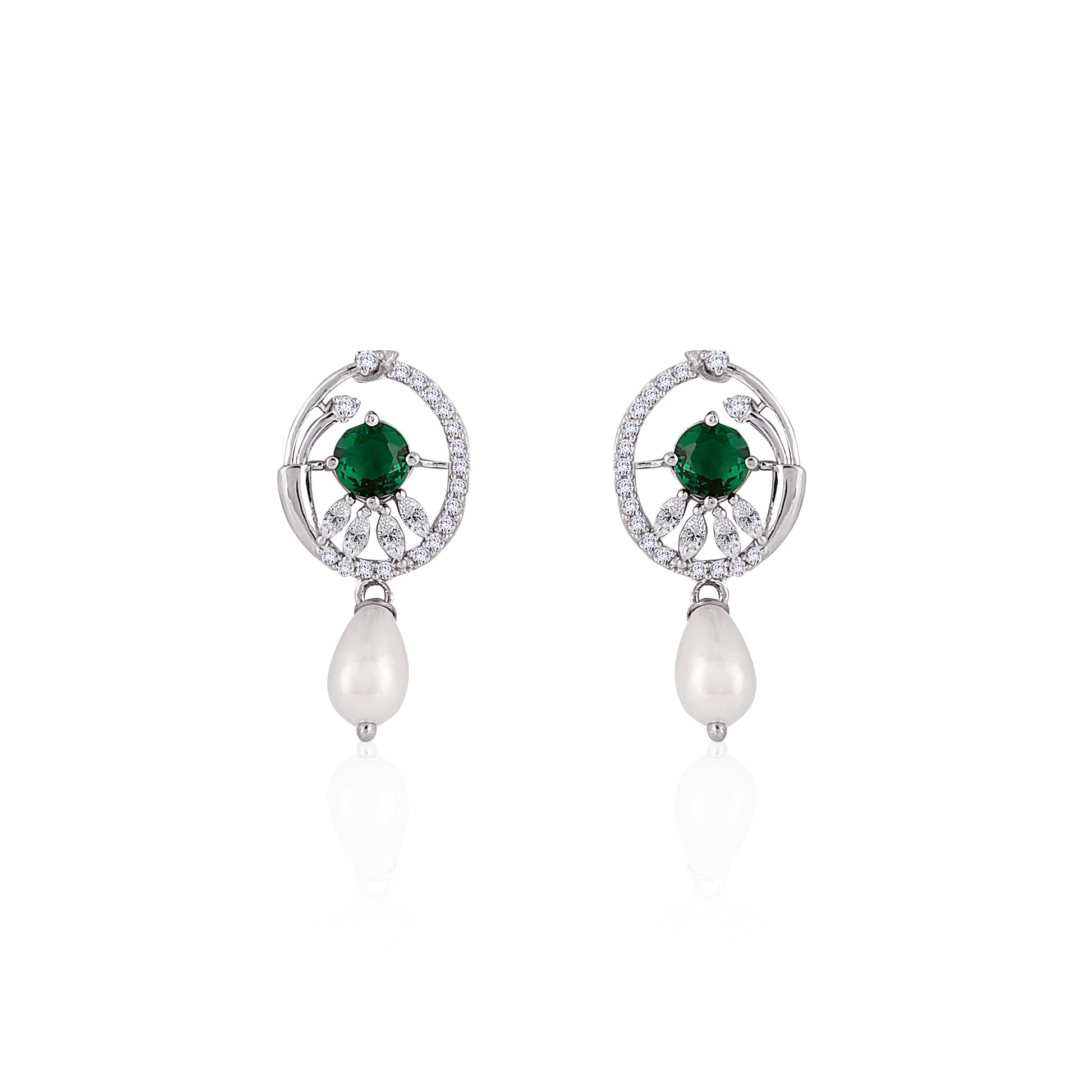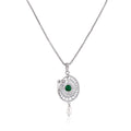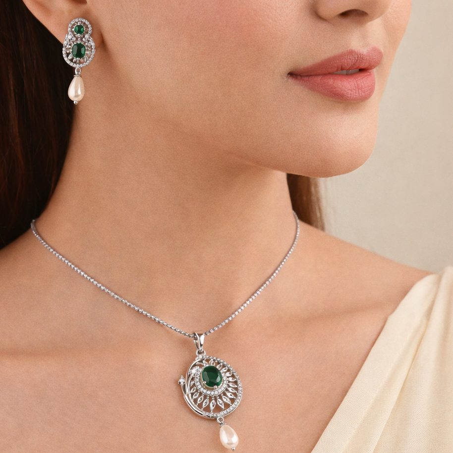 This beautifully designed 925 silver pendant and earring set showcases a vibrant green centerpiece surrounded by shimmering CZ stones, finished with elegant pearl drops. The rounded, detailed motif adds a touch of modern sophistication, while its rich colour pairing bringsΒ luxury appeal to any outfit.Β Perfect for weddings, festive celebrations, or gifting someone who loves refined jewelry.