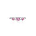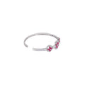 This exquisite 925 sterling silver kada bracelet showcases a trio of floral motifs, each adorned with radiant ruby-red gemstones arranged like delicate petals. The flowers are encircled by shimmering cubic zirconia, adding brilliance and elegance to the design. Perfect for festive occasions and celebrations, this bracelet combines timeless artistry with vibrant charm.