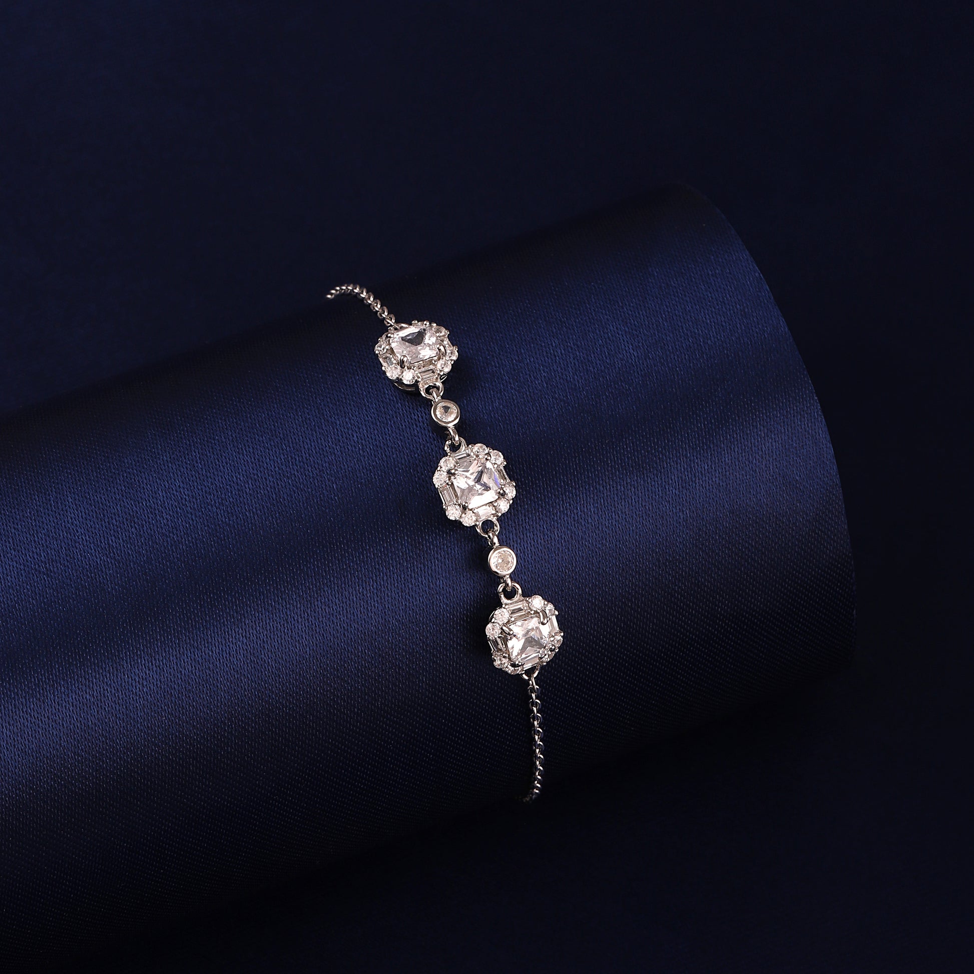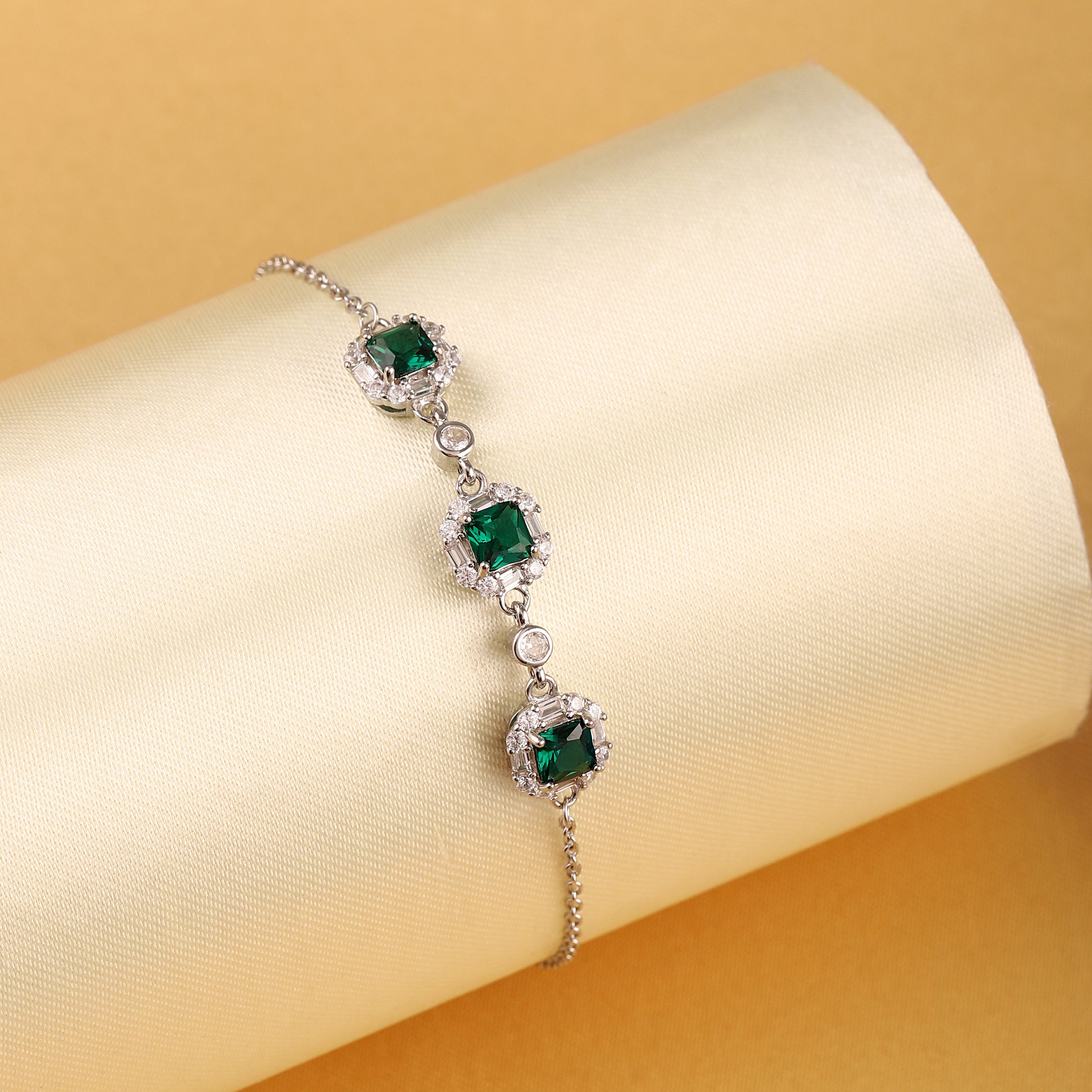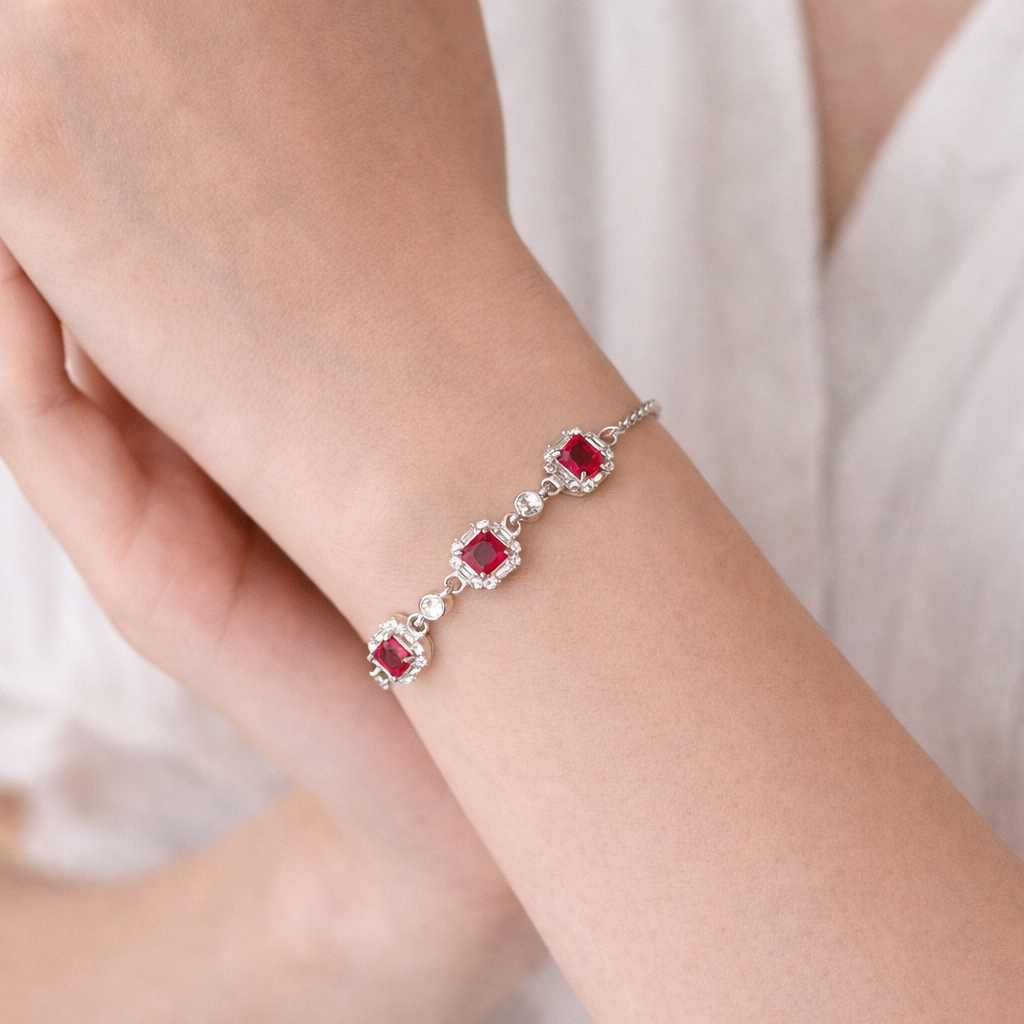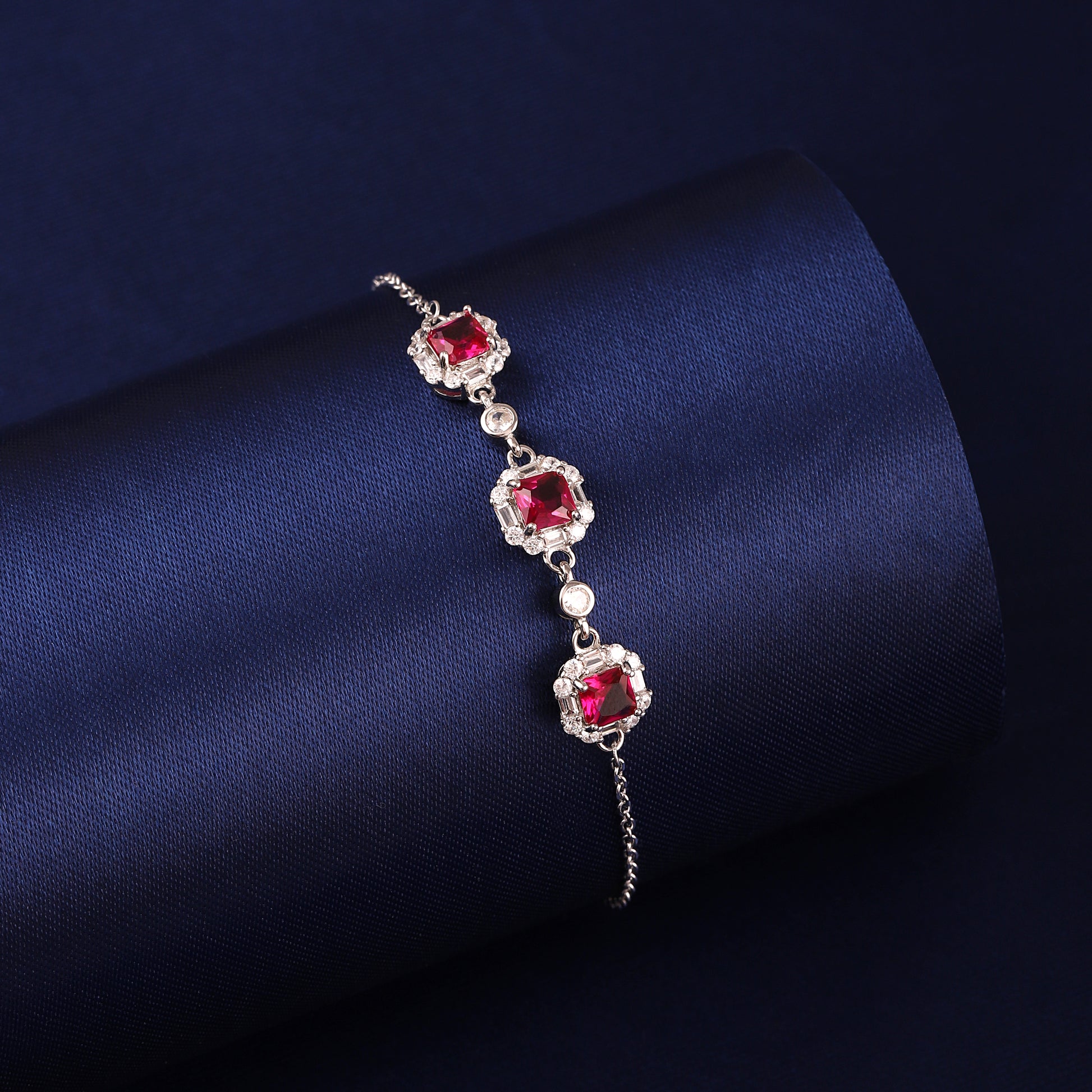 Add a touch of vibrant elegance to your wrist with our Sparkling Charm Bracelet Collection, meticulously handcrafted in premium 925 silver. This stunning bracelet is available in four breathtaking colorways—Fiery Ruby-Red, Timeless Diamond-White, Regal Sapphire-Blue, and Lush Emerald-Green—each featuring three brilliant princess-cut center stones. Every stone is enveloped in a majestic rectangular halo of shimmering accents and connected by brilliant circular spacers to create a continuous, luxurious glow. Expertly designed with a high-shine finish and an adjustable extender for a perfect, comfortable fit, this 925 silver bracelet is the ultimate choice for bridal wear, grand celebrations, or adding a sophisticated pop of color to your everyday style.