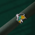 Radiating warmth and elegance, the Sunlit Meadow Butterfly 92.5 Silver Ring features butterfly-inspired wings in a stunning yellow-to-green gradient, capturing the glow of sunshine over lush meadows. The sleek 92.5 silver frame is adorned with a delicate arc and sparkling white stones that add a graceful shimmer. With its graceful design and vibrant color palette, this ring is a joyful celebration of nature's beauty—perfect for those who love fresh, uplifting jewelry that brings a touch of brightness to any outfit.