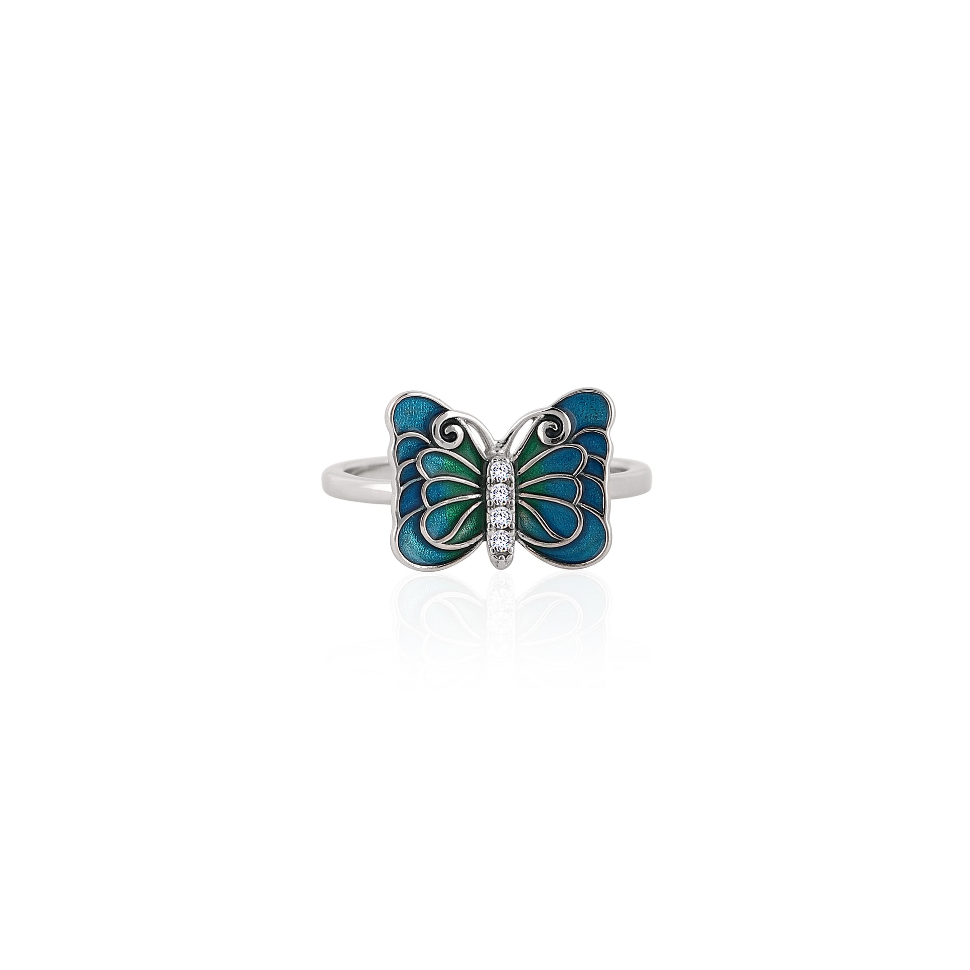 Experience the serenity of nature with this exquisite butterfly ring, featuring a mesmerizing gradient of teal and forest green enamel. Meticulously handcrafted in genuine 925 silver, the center of the butterfly is adorned with a row of sparkling stones for a touch of refined brilliance. A graceful statement piece that brings a sense of calm and beauty to any look. Sparkling crystal accents along the body add a luxurious finish to this nature-inspired treasure.