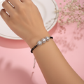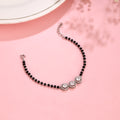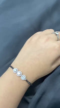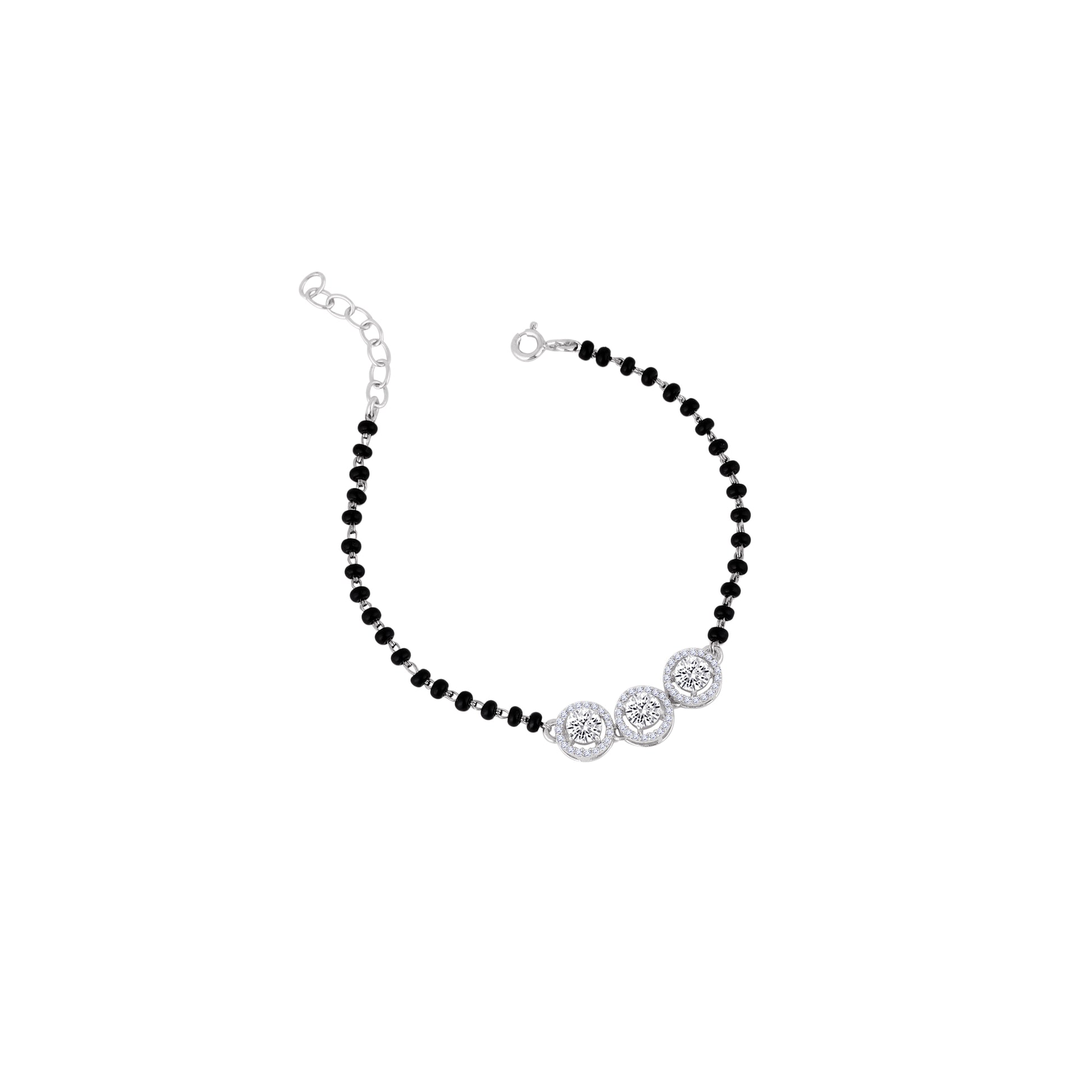 This elegant black beaded bracelet offers a striking blend of traditional charm and modern glamour. It features three stunning clear crystal halo stations, each designed to capture and reflect light beautifully. Exquisitely crafted from genuine 925 silver, this piece provides superior durability and a brilliant, anti-tarnish finish that enhances the sparkle of the stones. It is a versatile accessory perfect for daily wear or as a sophisticated touch for special occasions.