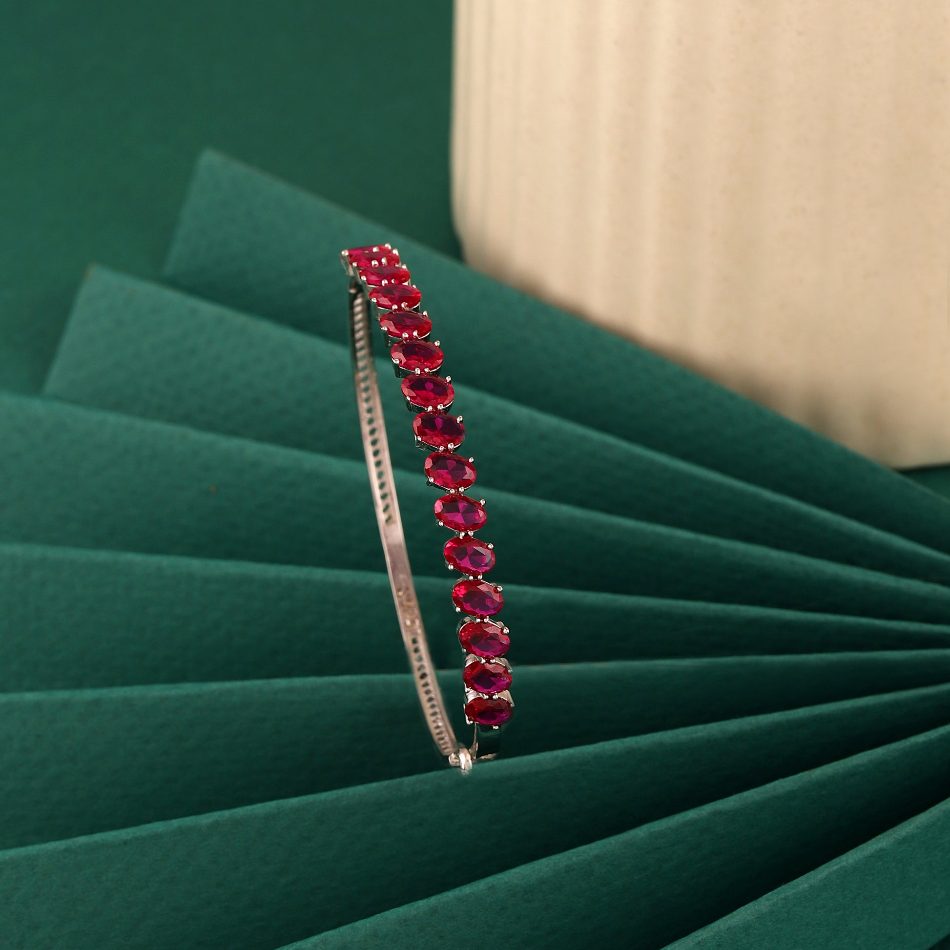 Make a bold statement with this stunning bracelet, featuring a continuous row of intensely colored oval ruby stone simulants set in a secure bezel style. Crafted with premium 925 silver, this piece offers a luxurious weight and radiant shine, perfectly complementing the deep red stones. The refined design makes it an excellent choice for special events or formal evening wear. Its secure closure ensures comfortable and confident wear, maintaining an elegant, unbroken line of sparkle on your wrist. This vibrant, eye-catching piece makes a spectacular gift.